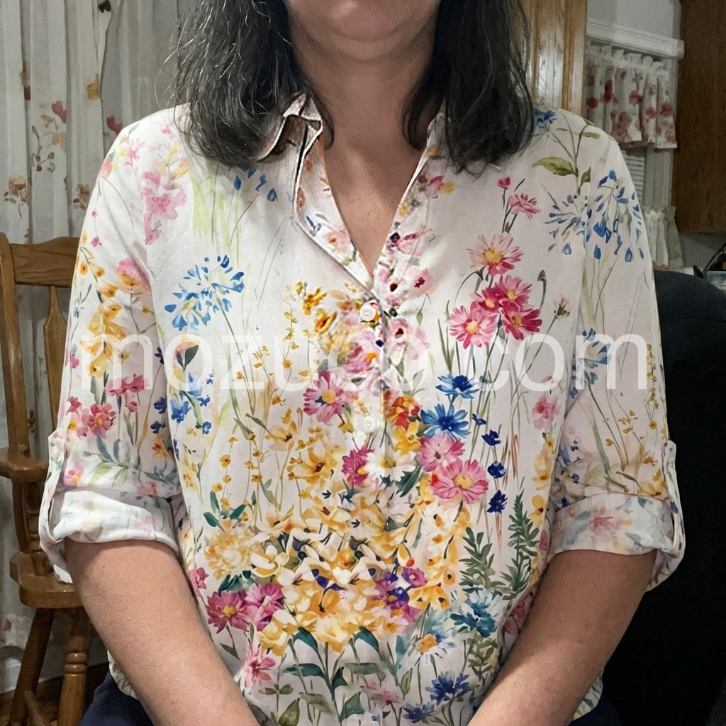 The collar and V-neck line give this shirt a nice classy touch. It feels very breezy. I added a chunky necklace and it looks stunning.