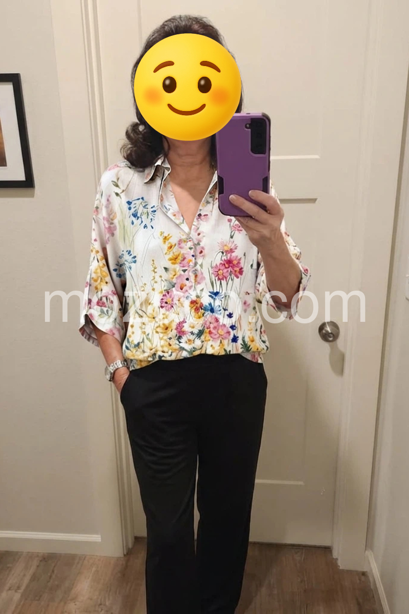 Absolutely love the floral pattern on this top! The colors are so vibrant and perfect for spring. It fits perfectly and feels very lightweight.
