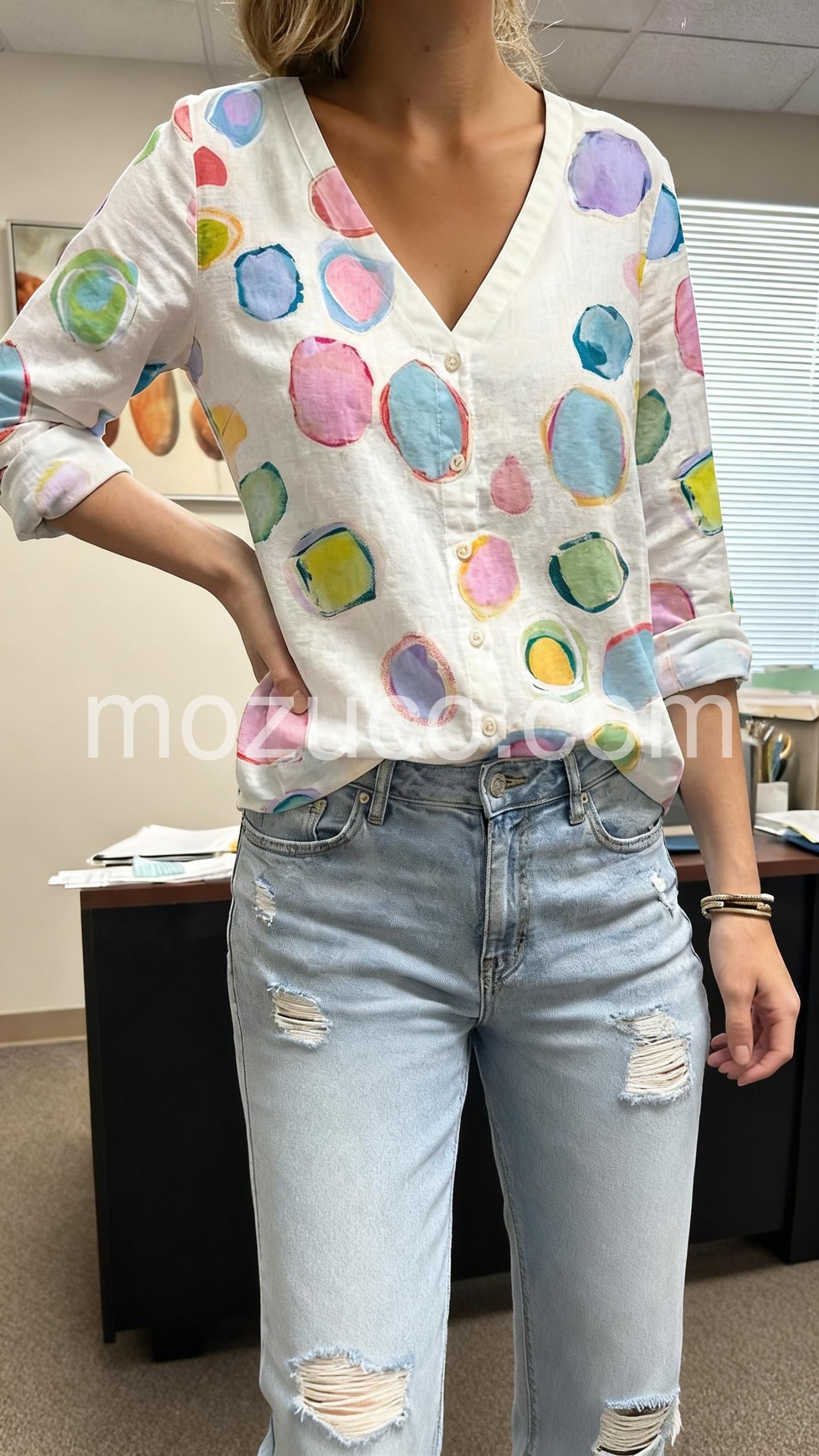 This blouse features a vibrant watercolor-style polka dot print on a soft white base. The relaxed fit and button-down front add casual charm. Rolled sleeves and side pockets enhance comfort. Perfect for pairing with jeans or shorts. Ideal for spring and summer days.