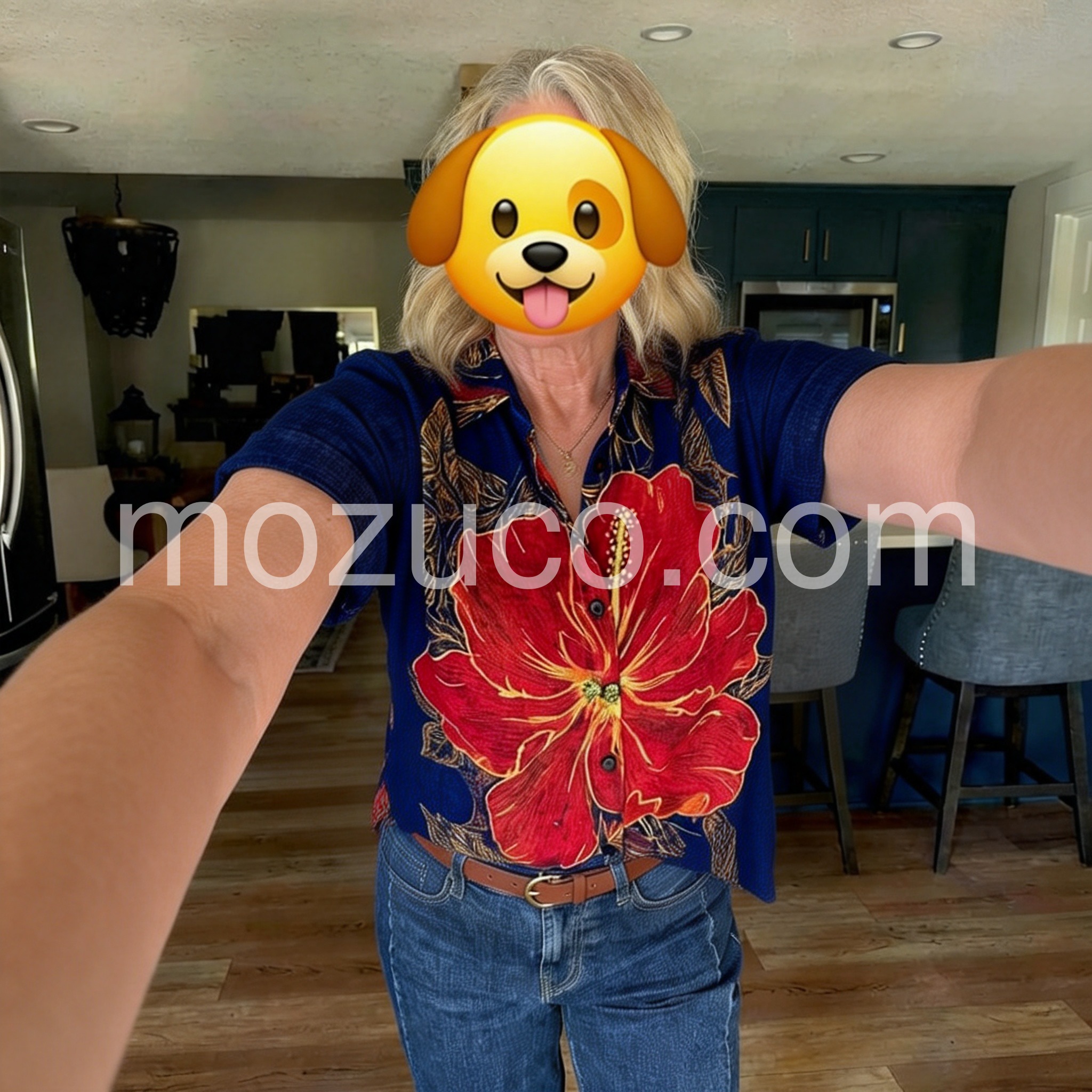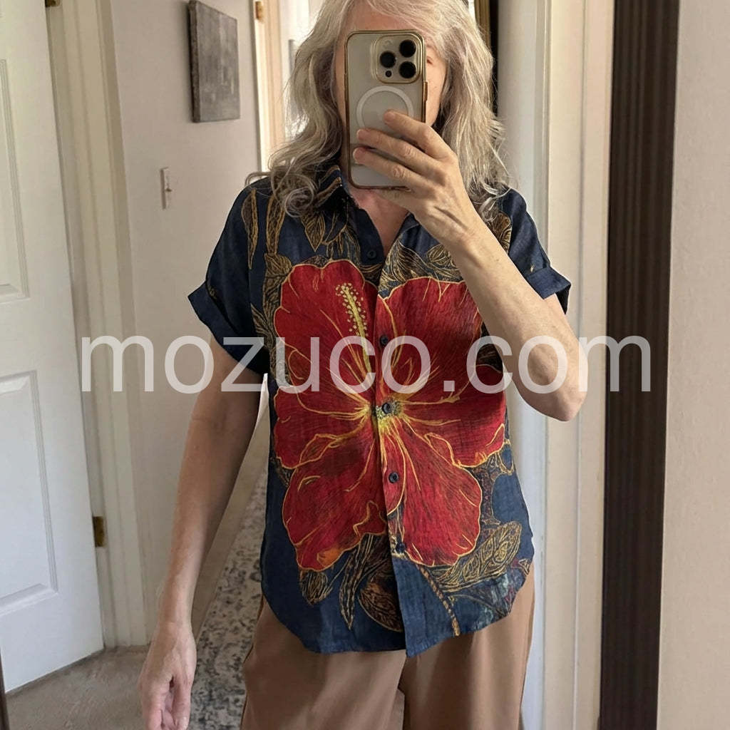 The detail on the gold leaves and the big red flower is gorgeous. It does not look cheap at all. Definitely one of my favorite summer shirts now.