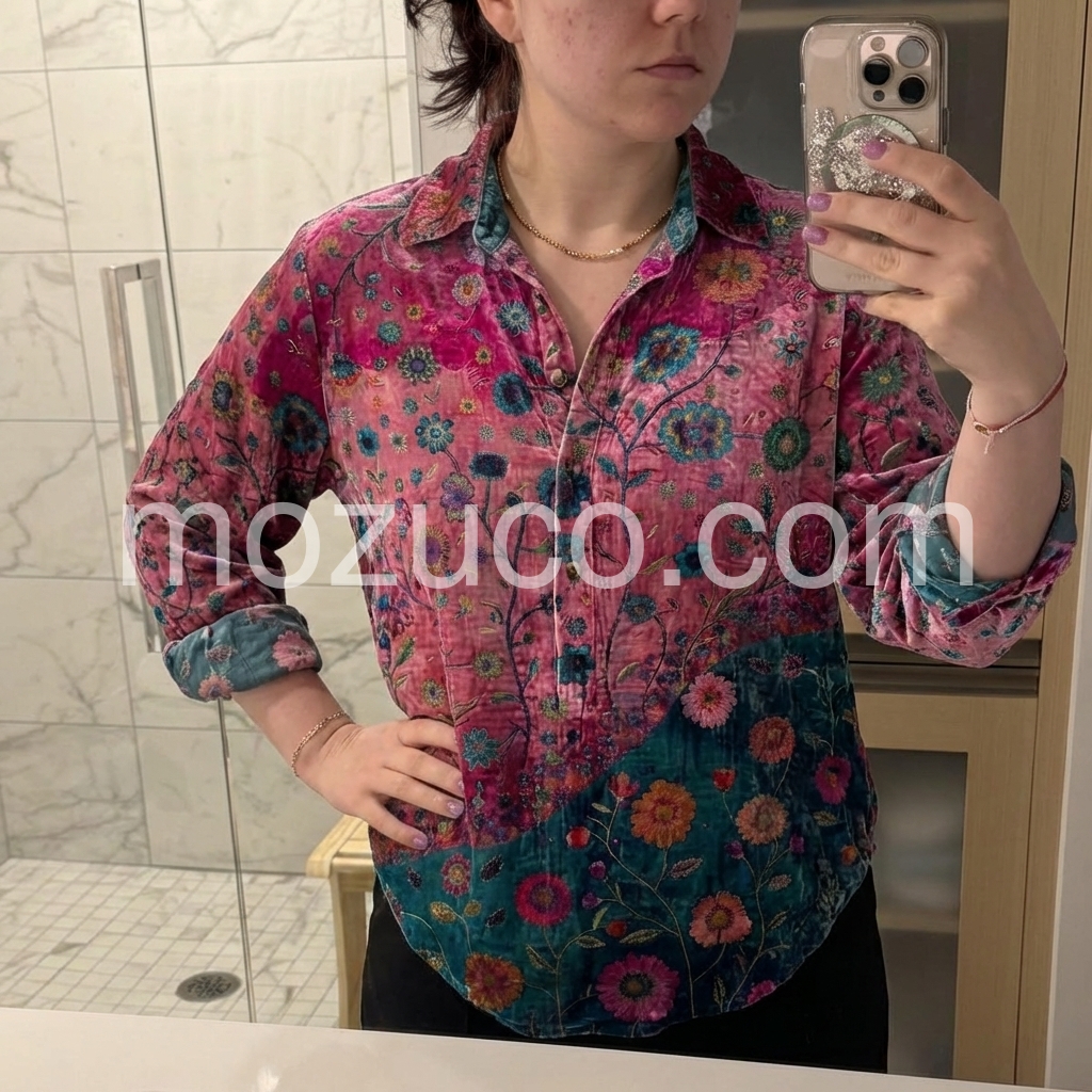 Beautiful shirt! It has a really lovely subtle sheen to the fabric that makes it look much more expensive than it is. The contrasting floral design really pops. Highly recommend if you want to add some color to your wardrobe.