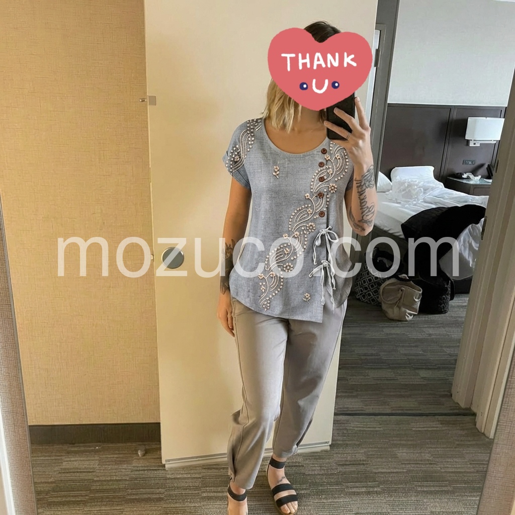 Perfect boho top! The grey color is very versatile. I love the short sleeves and the overall airy feel. I washed it twice already and the embroidery held up perfectly.
