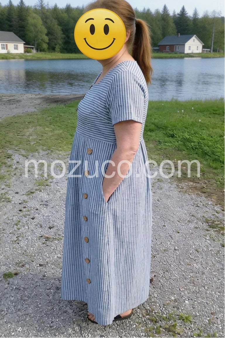 I absolutely love this dress! The pockets are a huge plus for me. The blue and white stripes are so classic for summer, and the material is really lightweight and breathable. Highly recommend!
