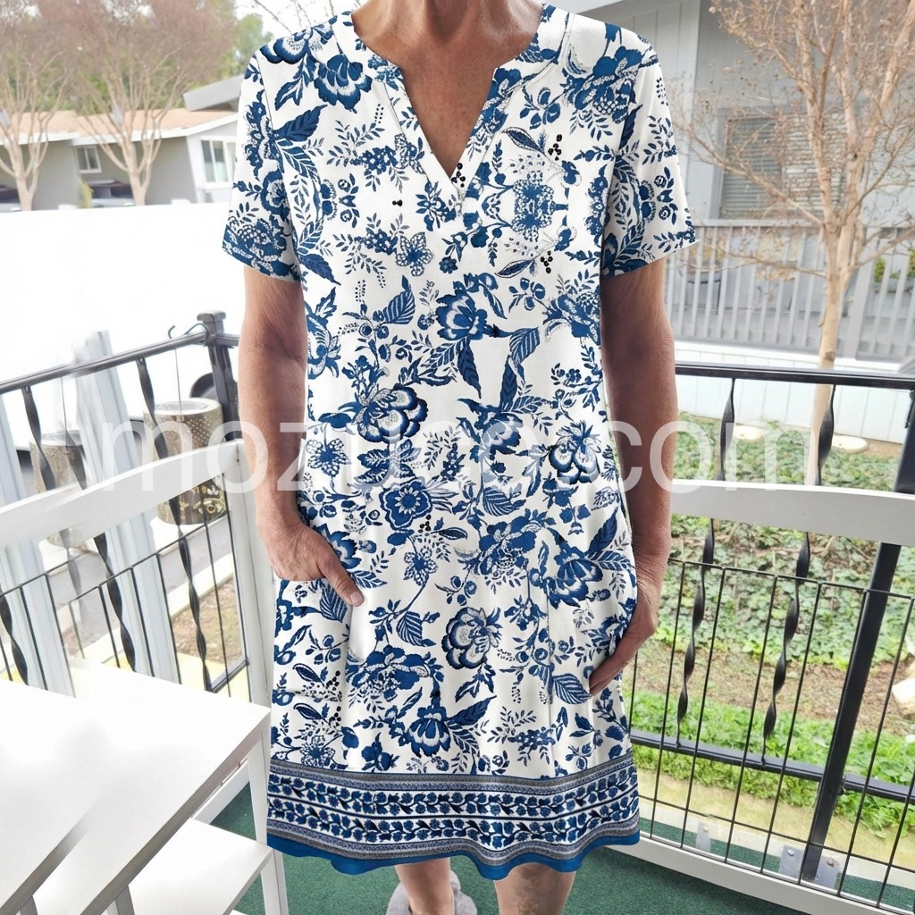 I absolutely love this dress! The blue and white floral pattern is so crisp and perfect for summer. And the best part? It has pockets! It fits perfectly and is very comfortable for all-day wear.