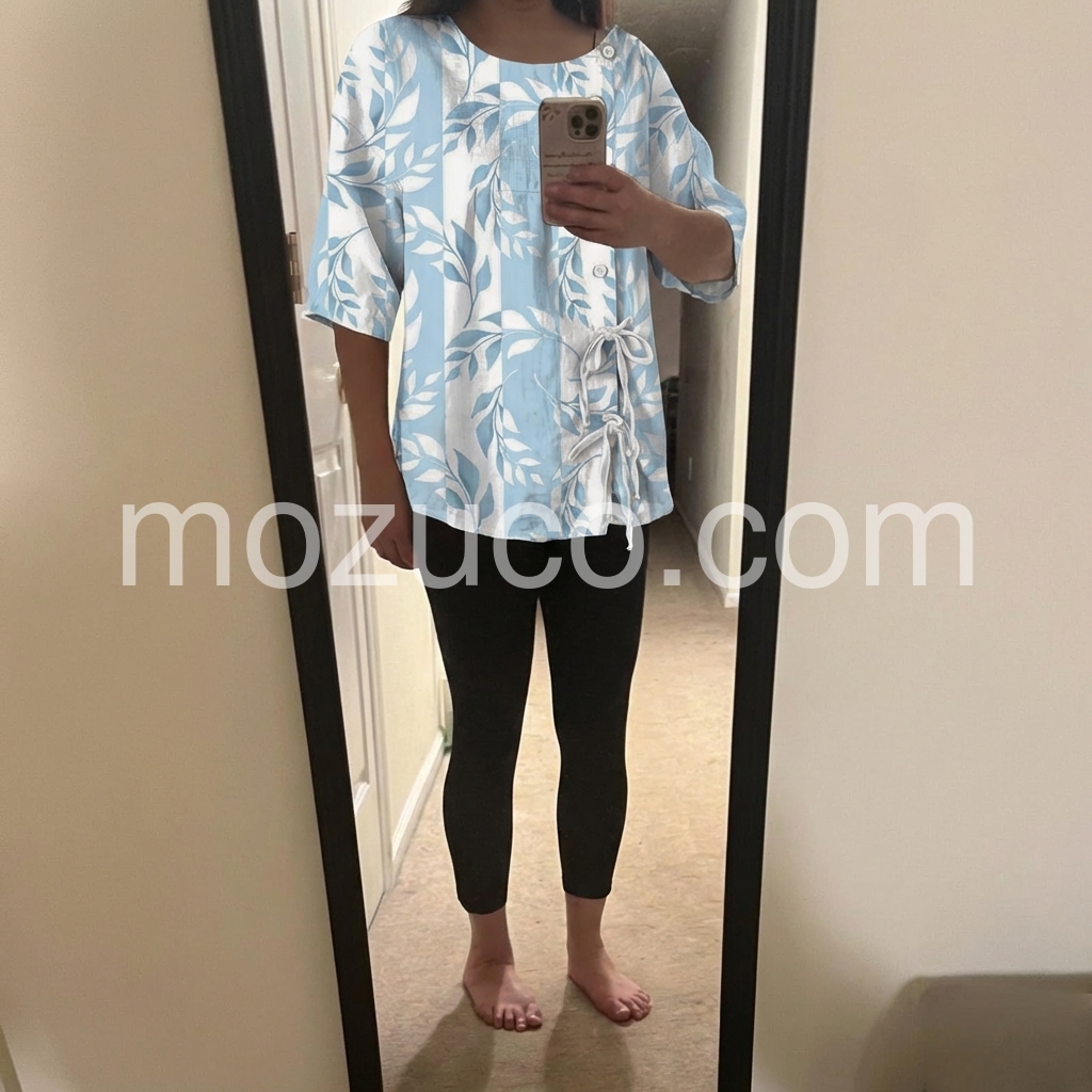 Love the leaf print and the soft blue color. It is very flowy and hides my tummy well. The side tie adds a cute touch!
