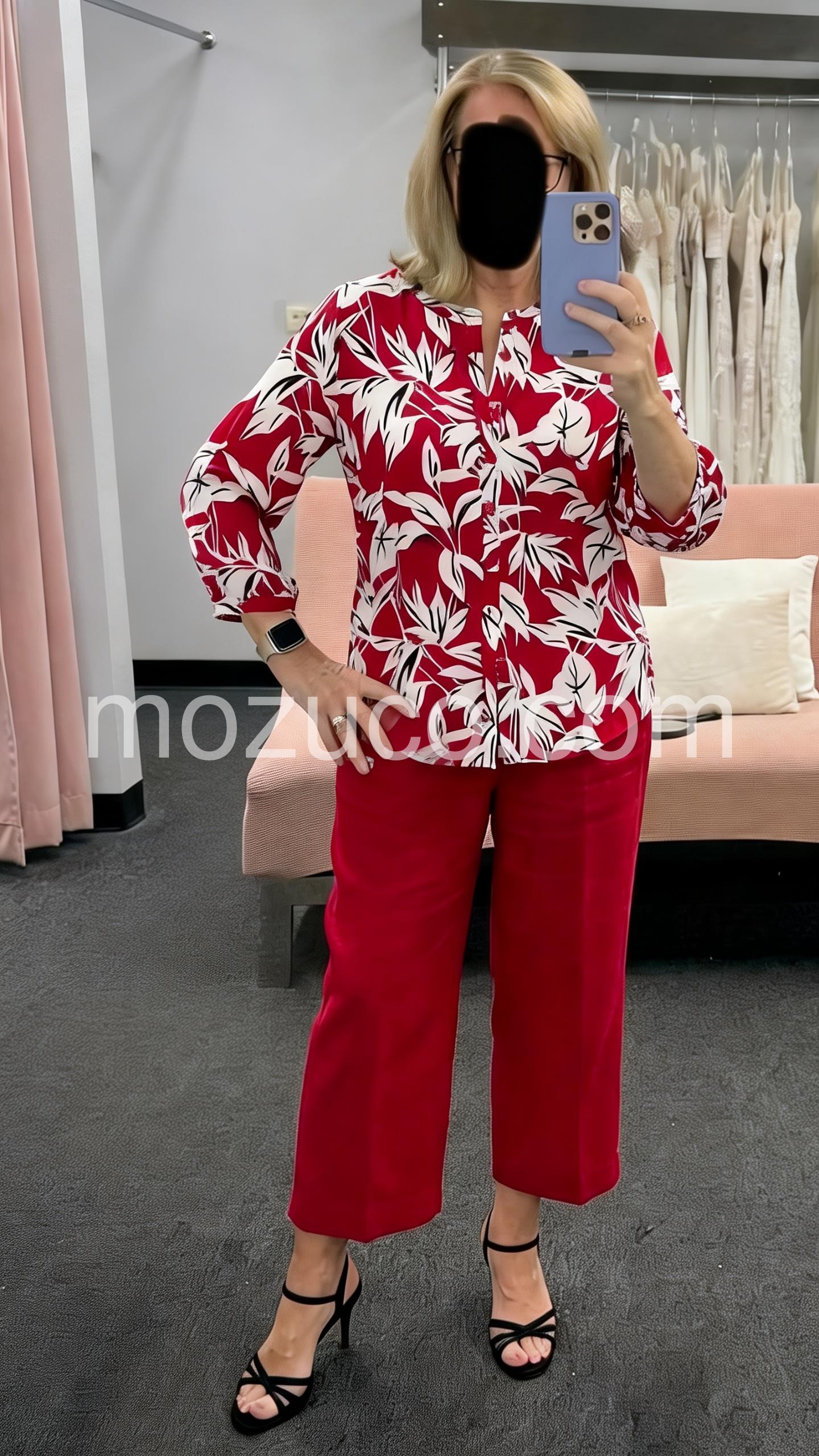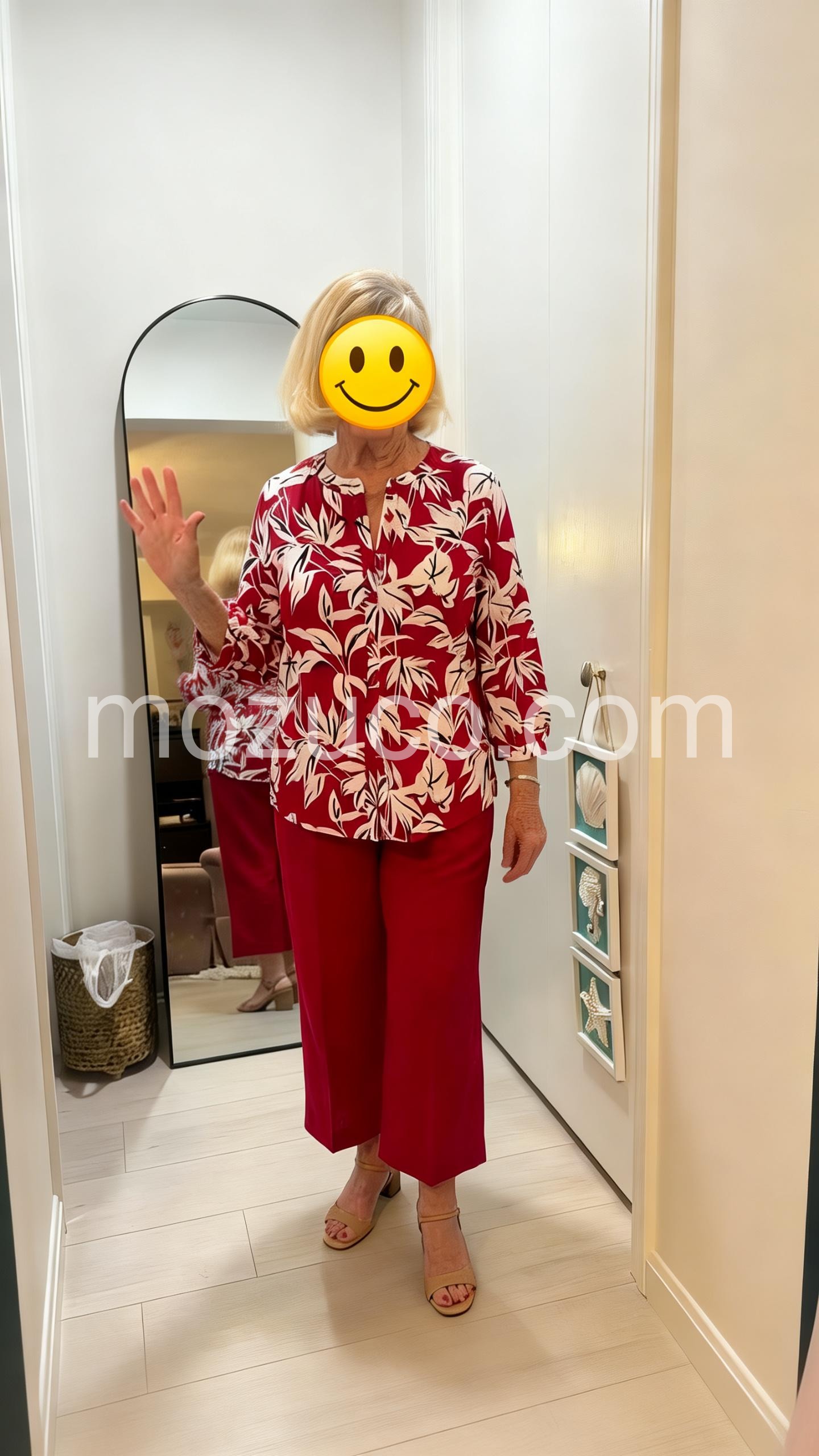 This coordinated set features a vibrant red blouse with white leaf print and button-front detail. Paired with matching cropped pants for a polished look. The three-quarter sleeves add a touch of elegance. Perfect for casual outings or warm-weather events. Confident, chic, and easy to wear.