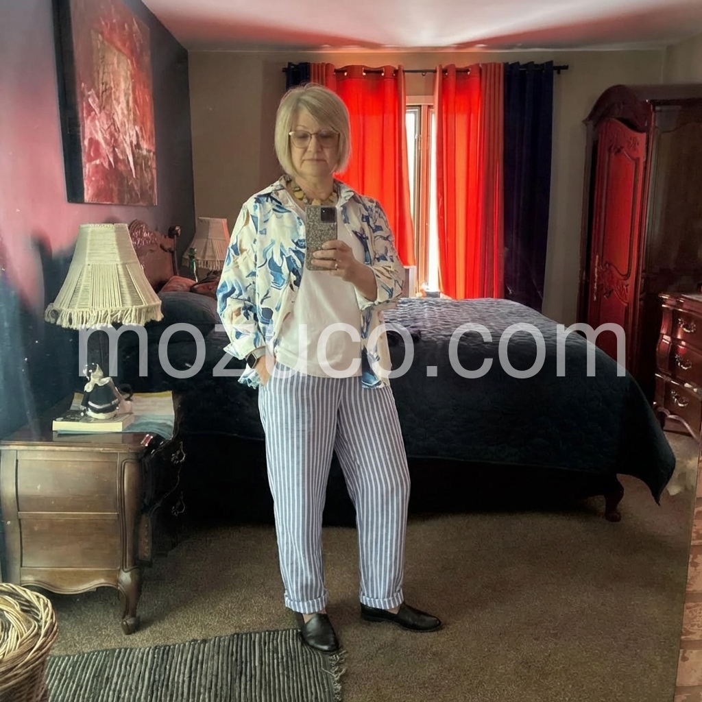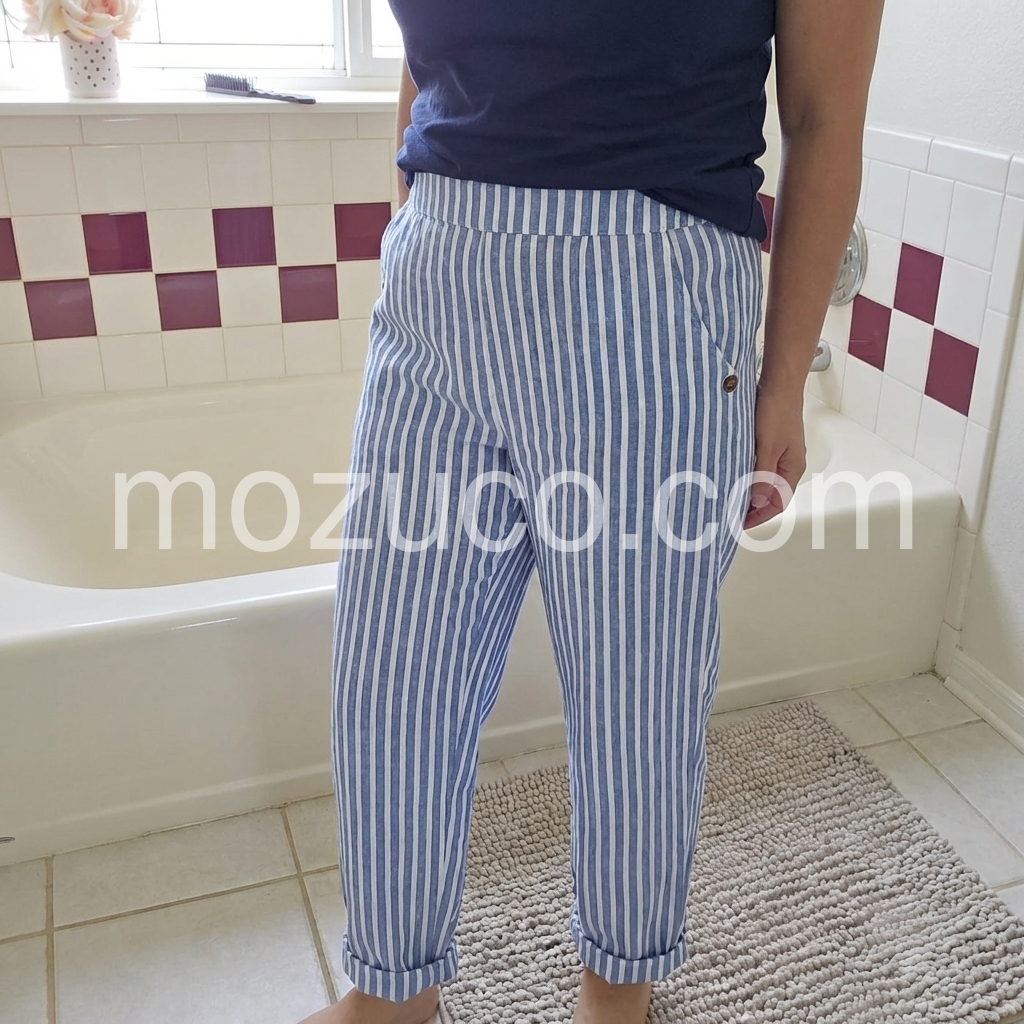 I am absolutely thrilled with these striped trousers. They are comfortable enough for all-day wear and look very chic. The rolled hem gives them a modern touch. They fit perfectly around my waist and leave plenty of room in the legs.