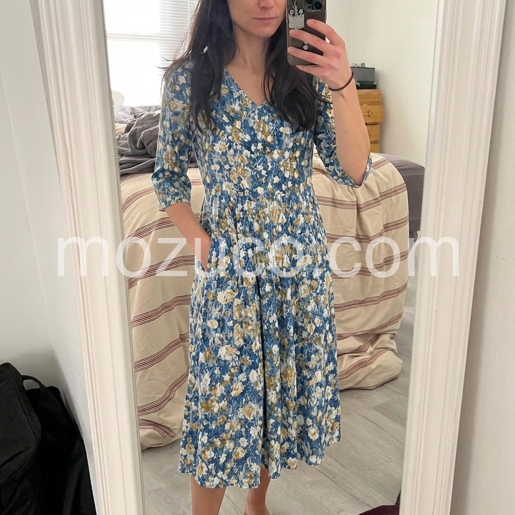 Absolutely love the blue and yellow floral pattern. The v-neck is flattering without being too deep, and the flowy skirt is so comfortable.