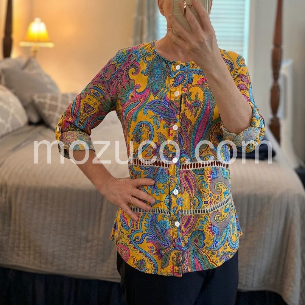 I absolutely love this top! The paisley pattern is so vibrant and beautiful in person. The mustard yellow color really pops. It fits true to size and the length is perfect to wear with leggings or jeans.