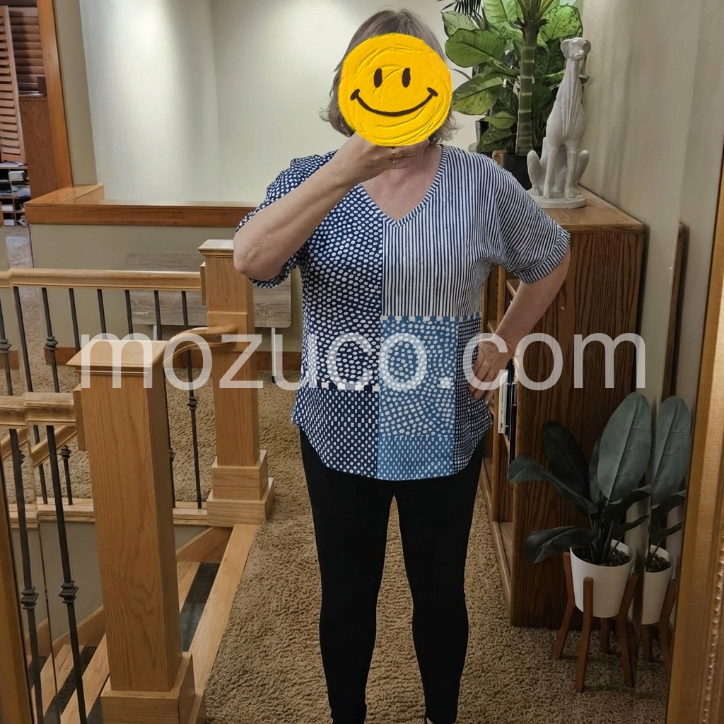 I love the artsy vibe of this patchwork tunic! The different shades of blue blend together so well. It is very comfortable, not clingy at all, and the short sleeves are a great length. I will definitely be ordering more from this brand.