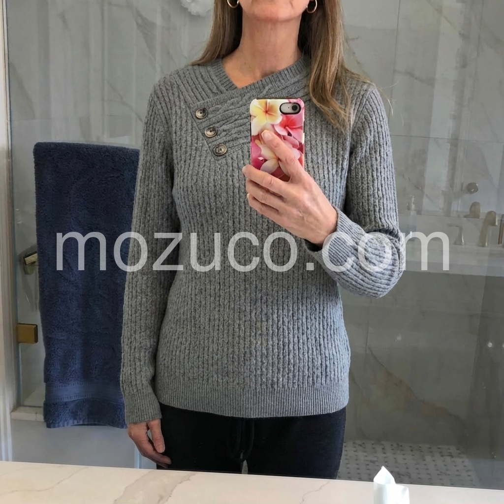 This gray knit sweater is a fall essential! The textured waffle knit feels incredibly soft and warm, perfect for crisp days. The asymmetrical neckline with three gold buttons adds a chic, tailored touch—elevating the simple design. The relaxed fit is cozy yet flattering, and the cuffed sleeves keep the look polished. I’ve paired it with jeans and leggings, and it works for every casual occasion. Love how versatile and comfortable it is!