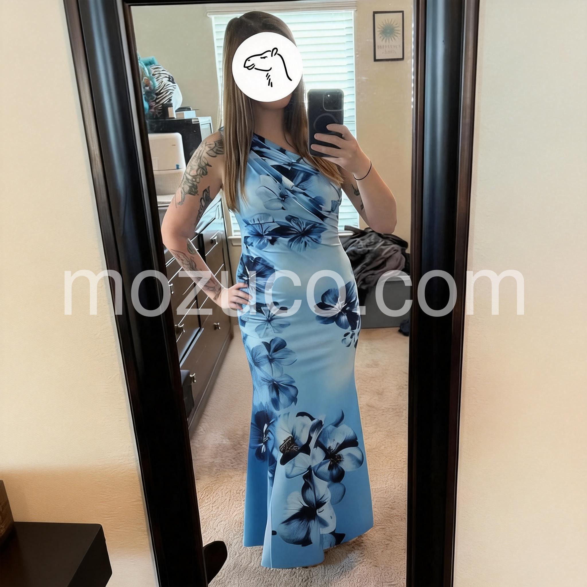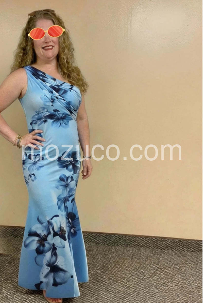 I felt so glamorous in this! The gradient blue tones and the large flowers are just striking. It is form-fitting in the best way possible. Perfect for a tropical getaway or resort evening.