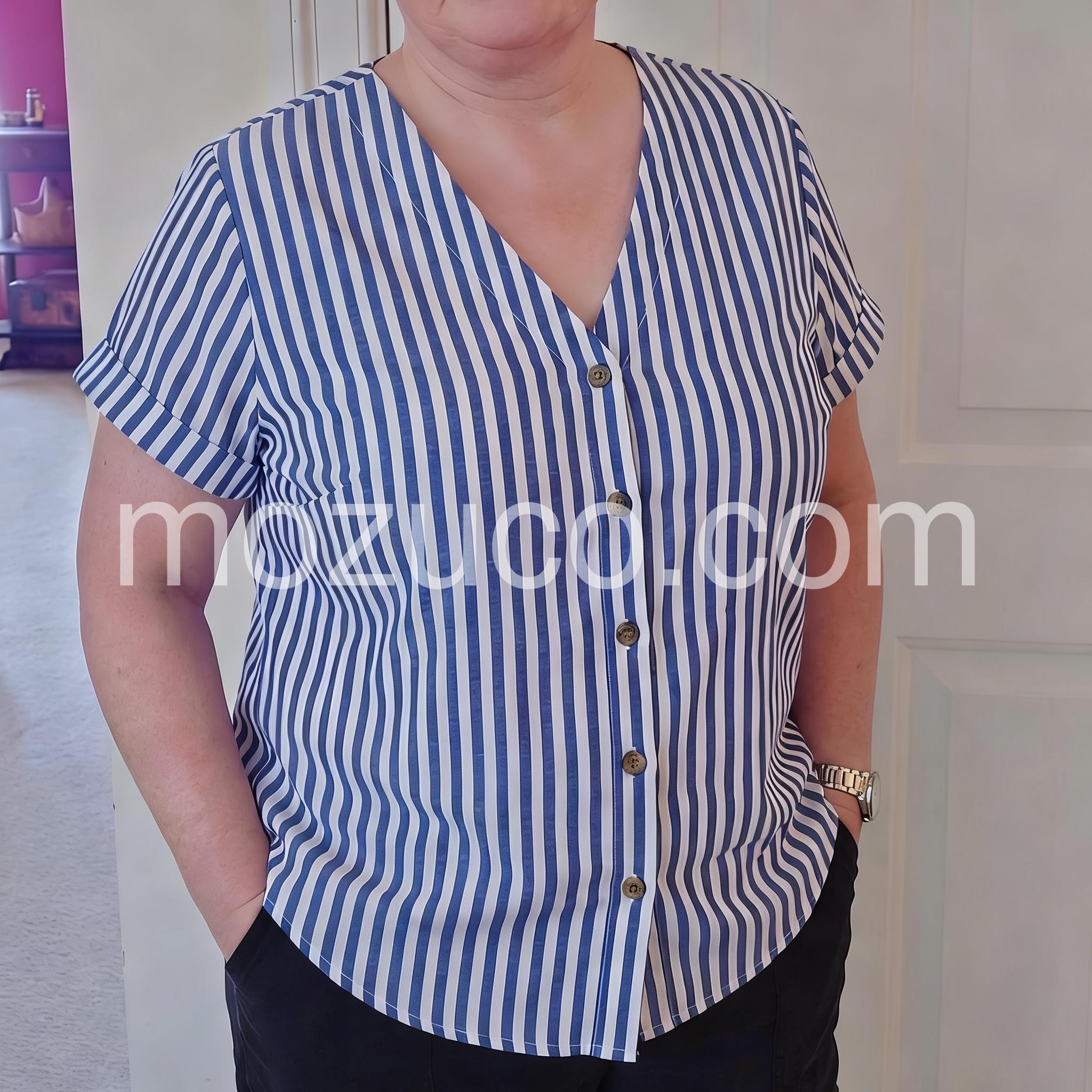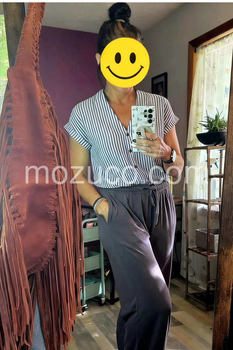 I absolutely love this striped blouse! The vertical lines are so flattering and slimming. The material is lightweight, making it perfect for summer weather. I paired it with jeans just like the model and it looks so effortlessly chic.