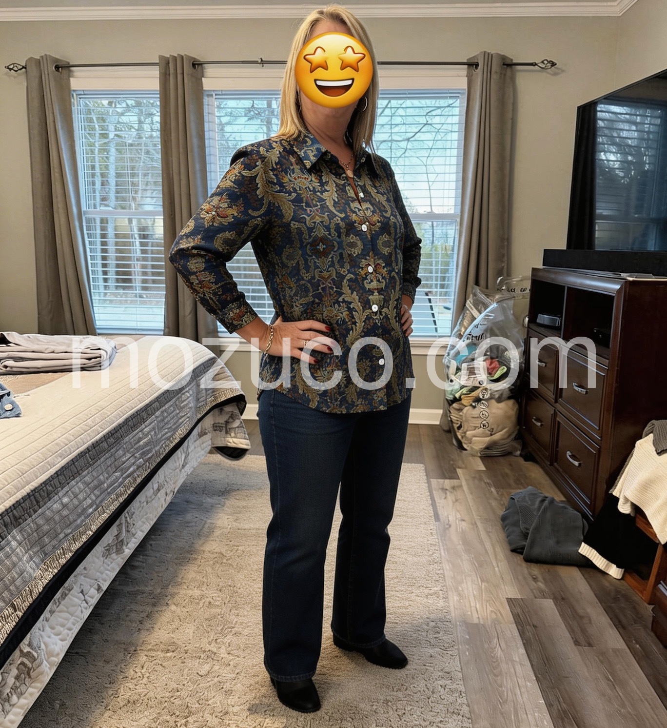 Beautiful garment with vibrant colors. I appreciate that the buttons do not gap at the chest, which is a common issue for me. It is incredibly flattering and makes me feel confident every time I put it on.