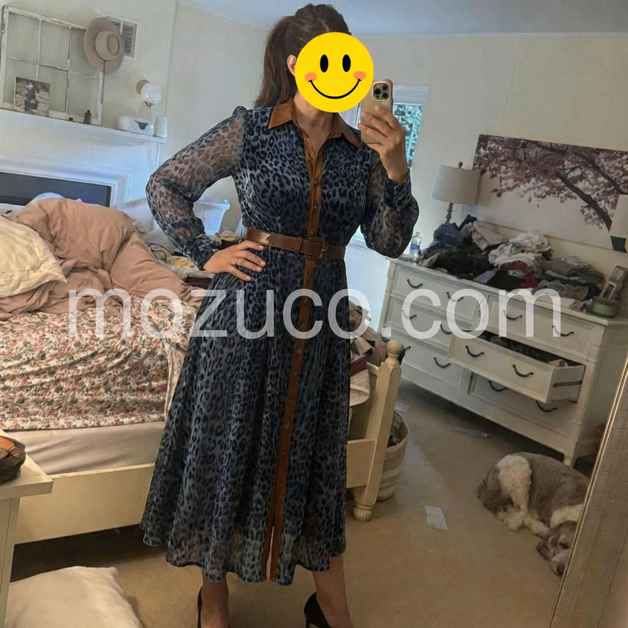 The contrast between the blue leopard print and the brown leather-like collar and belt is brilliant. It is a very fashion-forward piece. I paired it with a brown handbag and got stopped on the street by someone asking where I bought it.