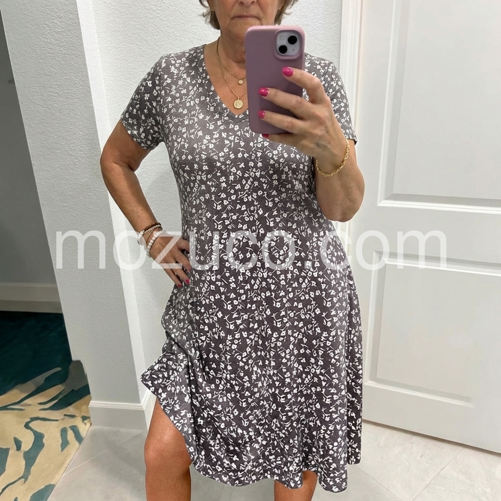 This is my new favorite everyday dress. The dark grey floral print is so pretty in person. It feels like a high-quality lightweight jersey material that breathes well in the heat. Highly recommend!