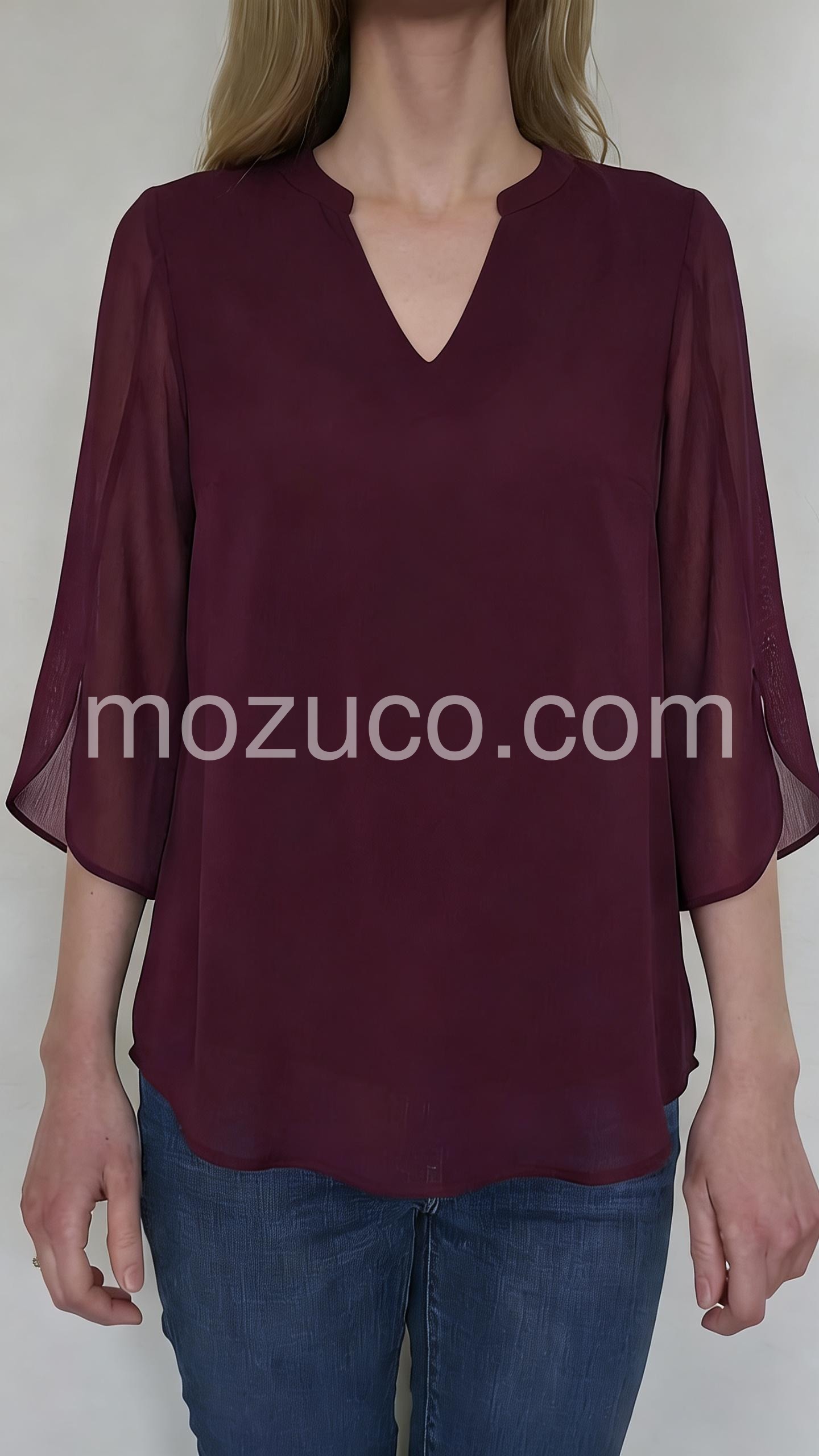 I absolutely love this blouse! The plum color is rich and beautiful. The double-layer design is perfect because it gives that elegant sheer look without being see-through. Fits true to size and hides my tummy perfectly. Highly recommend!