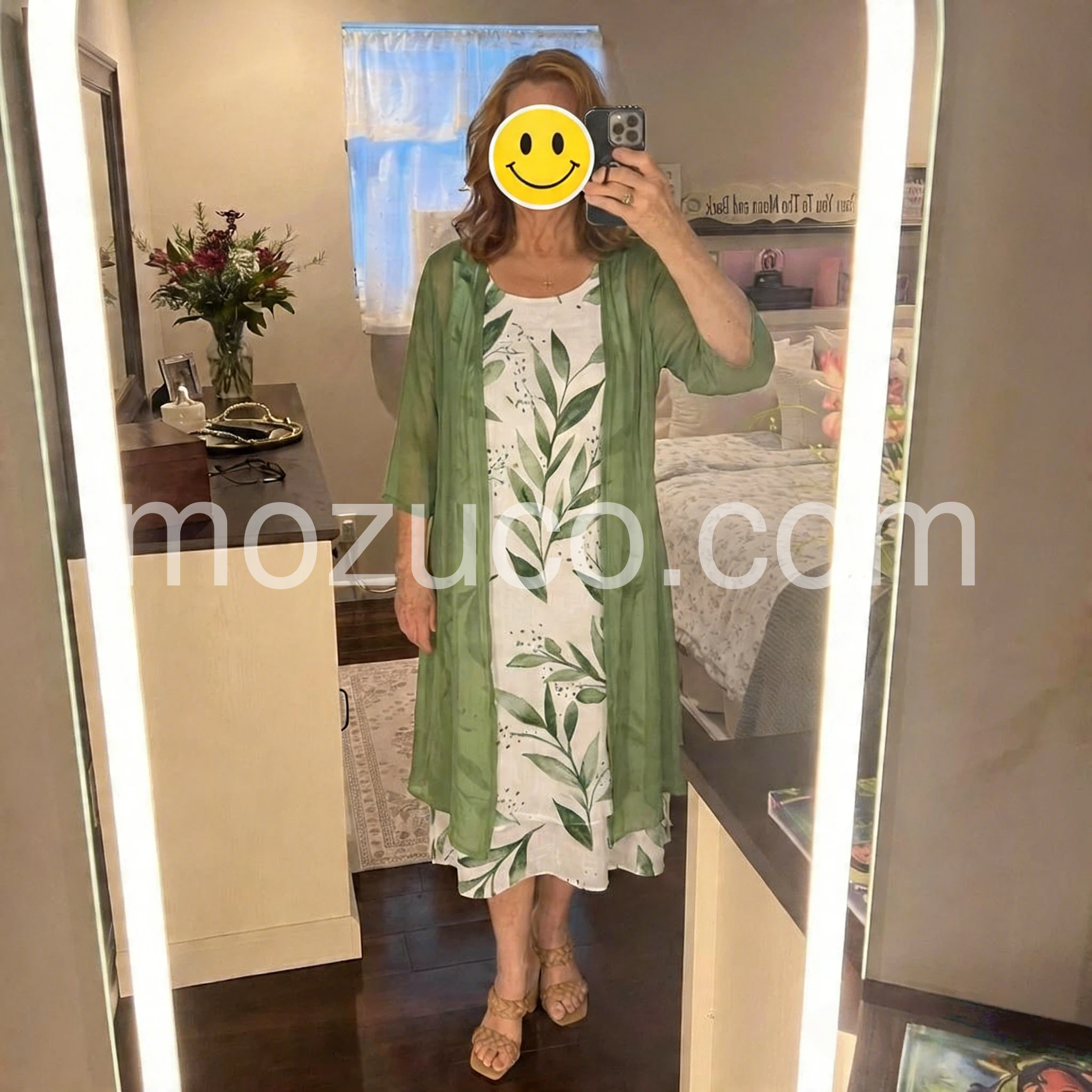 Absolutely love this two piece set! The dress flows beautifully and does not cling to my midsection. The green color is exactly as pictured. It is extremely comfortable for all day wear. Highly recommend.