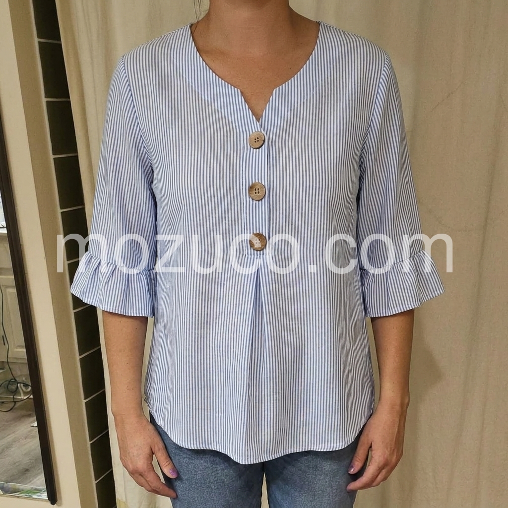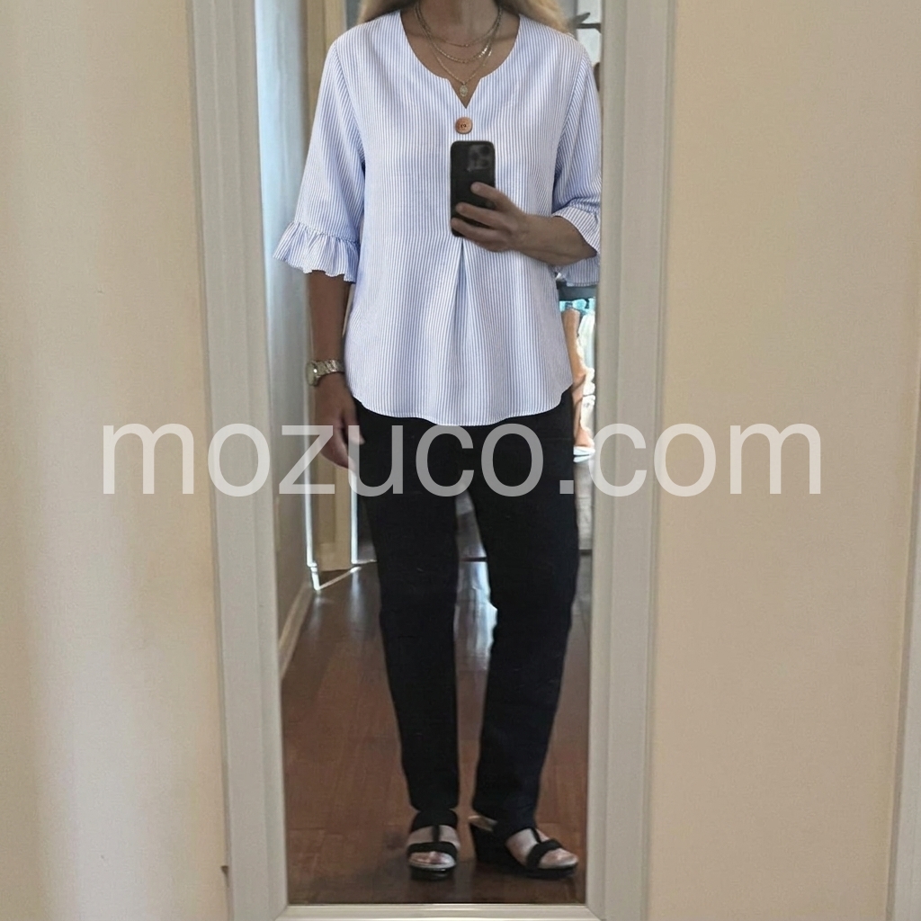 This shirt is very pretty and fits well.I am wearing a medium which is my normal size and the shirt fits well. The buttons on the sleeves add a nice detail and the floral print is very pretty. The length of the shirt can easily be worn tucked in or left out. The material is a little thin so you definitely need to wear something underneath but because it is lightweight, it is perfect for the fall or spring. Overall, this is a nice quality shirt that can be dressed up or down.