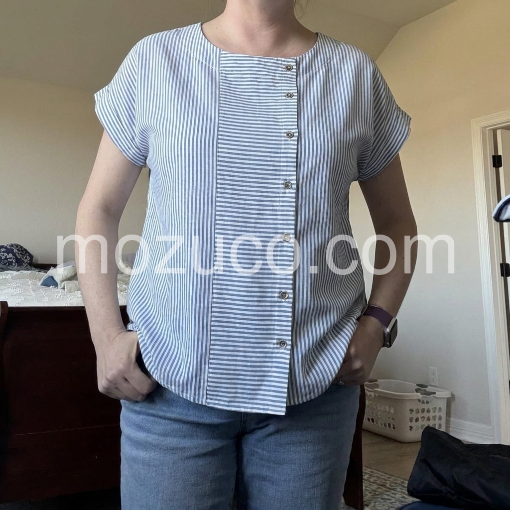 This is my new favorite summer shirt. The material is very lightweight and breathable, making it perfect for hot weather. The horizontal and vertical stripes are super flattering. I highly recommend washing it on a delicate cycle and hanging it to dry to keep it looking crisp.