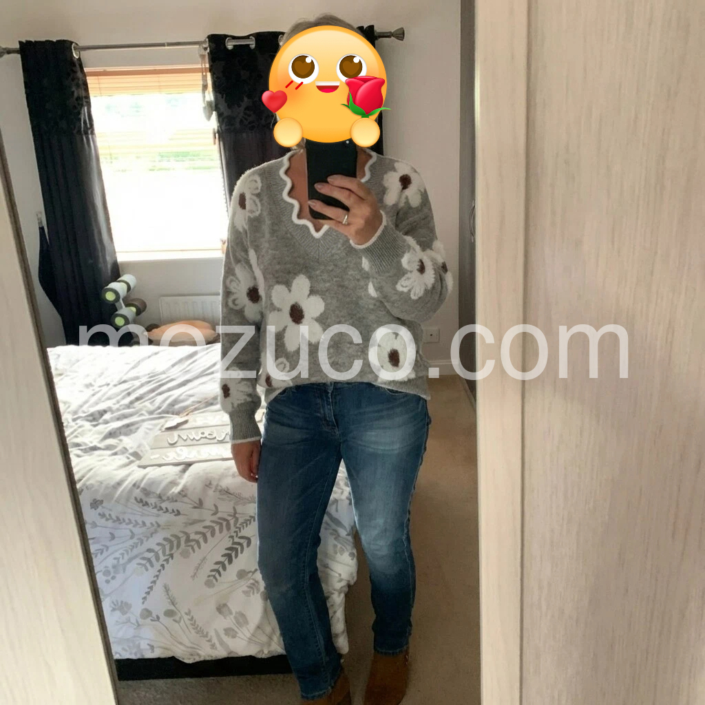 I’m really impressed with how well this sweater drapes and how comfortable it feels. The V-neck adds a subtle, flattering shape, and the sleeves sit nicely without feeling tight. The grey base color makes the whole print look extra vivid. I’ve worn it with my denim and it looks effortless—like I tried to style it, but without any effort. Definitely a go-to piece for cooler weather.