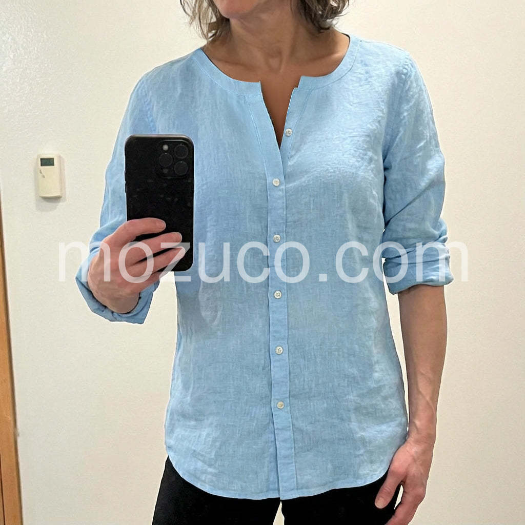 This button-down is incredibly flattering. It is loose enough to hide my tummy area but still looks stylish and put together. The baby blue is gorgeous.