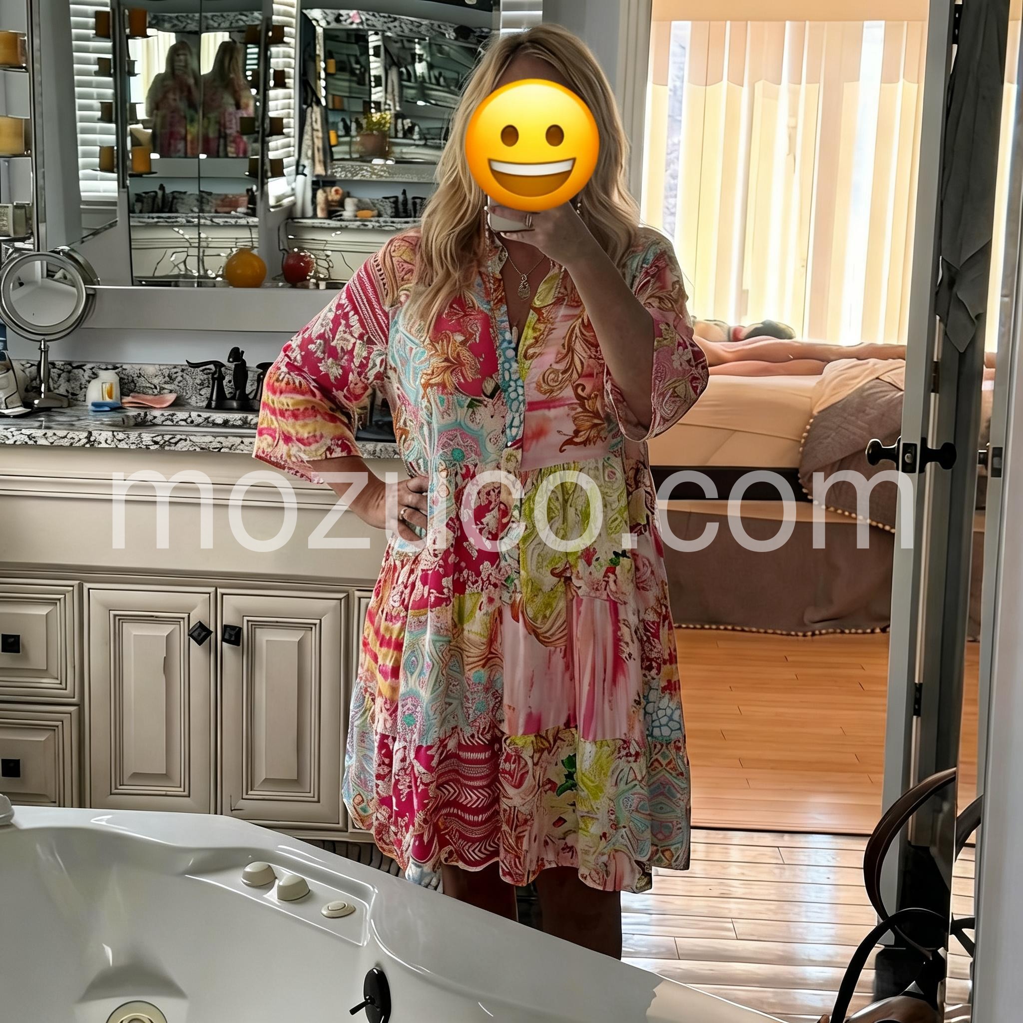 I am absolutely in love with the vibrant colors of this dress! It is so lightweight and perfect for summer. The patchwork design gives it a fun, boho vibe that I adore. It fits wonderfully and is incredibly comfortable for all-day wear.