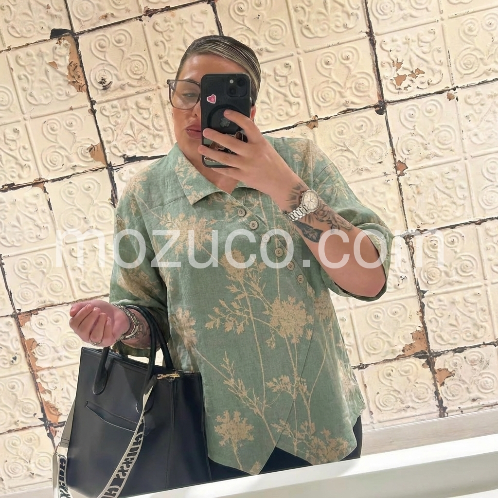This blouse is so unique! The floral pattern is subtle and elegant. I was pleasantly surprised by the quality of the fabric, it feels like a nice linen blend. The pointed hem adds a nice touch of style. Definitely a new favorite in my wardrobe.