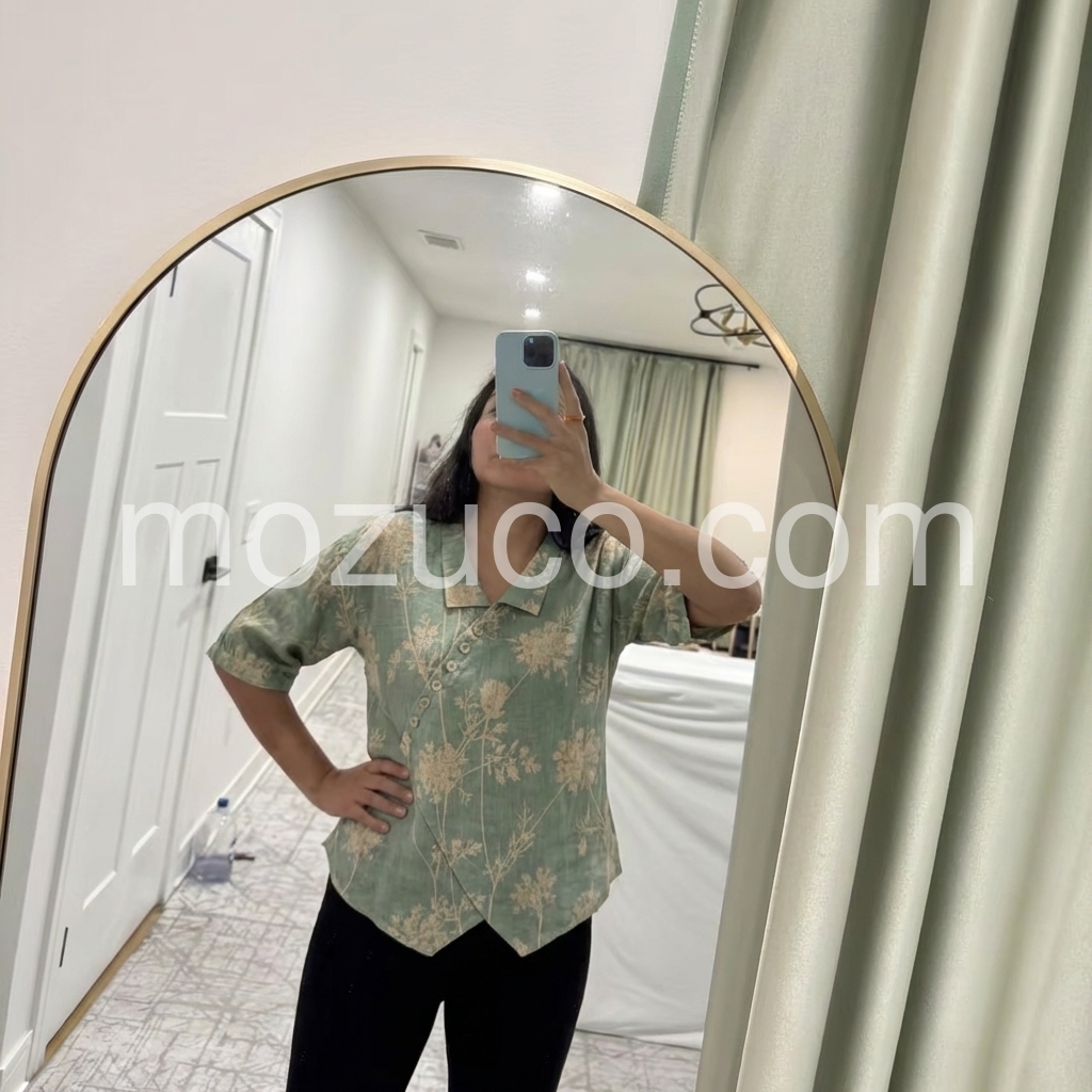 Beautiful spring shirt. The muted green is a lovely earthy tone, and the little flowers give it a vintage boho vibe. The half sleeves are great for transitioning weather. It fits very well and drapes nicely.