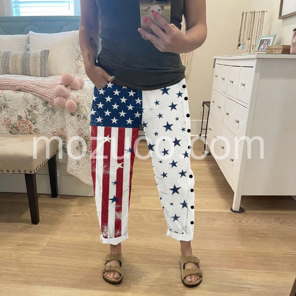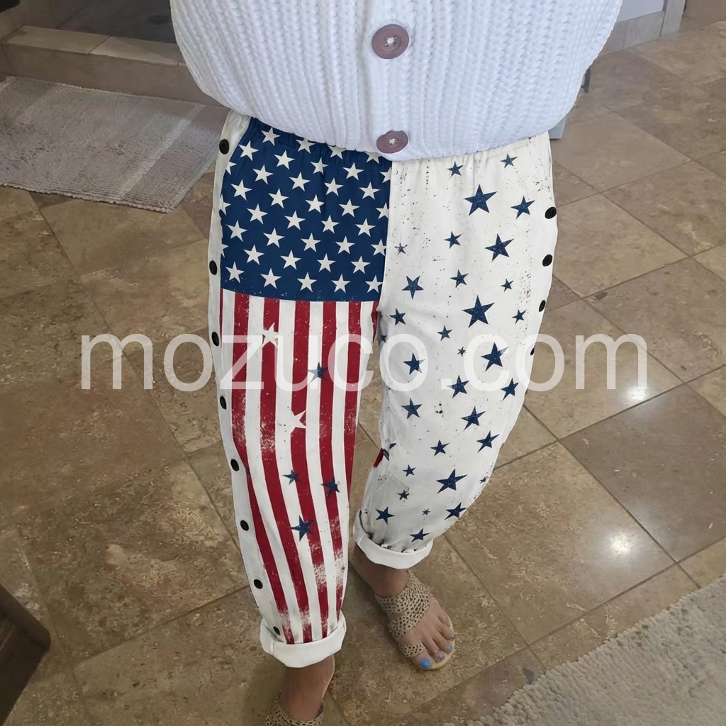 These loose-fit pants feature a bold American flag print with stars and stripes on one leg. Side button details add a unique touch. Elastic waistband and cuffed hems for comfort. Lightweight fabric perfect for casual wear. Ideal for summer outings or festive occasions.