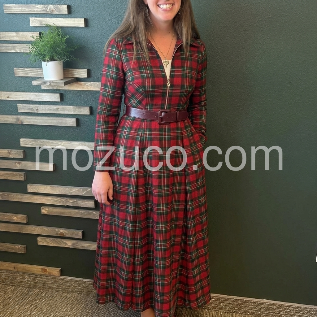 Distinctive Red Plaid Zip Front Long Sleeve Maxi Dress
