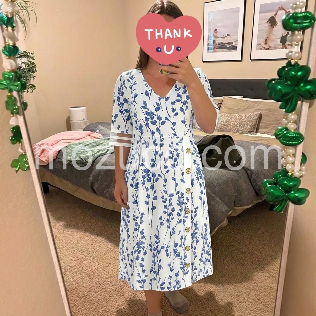 Beautiful print! The blue leaves on the crisp white background look so fresh and elegant. The material feels high quality, not cheap or overly see-through, though I always wear nude undergarments with white dresses just in case. Highly recommend this for summer.
