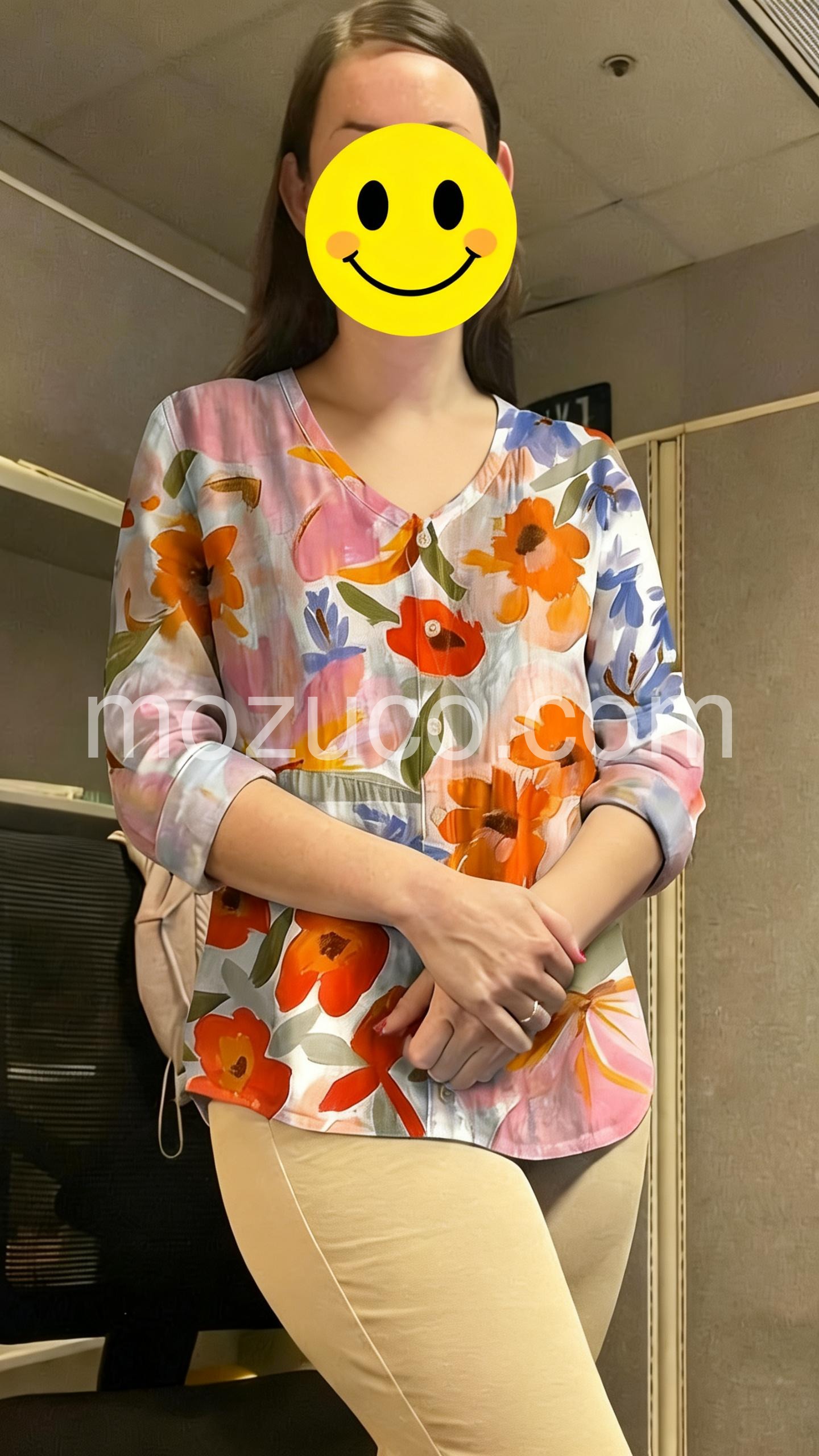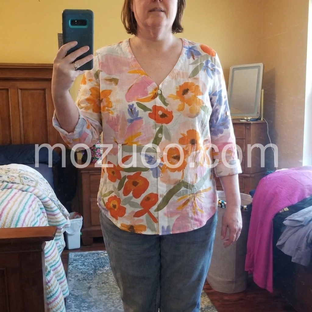 This blouse is so flattering. It has a slight flowy cut that hides my midsection without looking bulky. The colors are beautiful oranges, pinks, and blues.