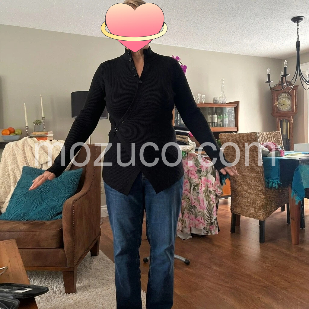 I’m really pleased with this piece. The black color is classic, and the ribbed texture looks high quality. The button-front detail is flattering, and the fit is comfortable through the shoulders and arms. It feels soft and easy to wear, and it layers well over other tops. Overall, it matches the photos nicely and I’ve already gotten a lot of compliments—great purchase.