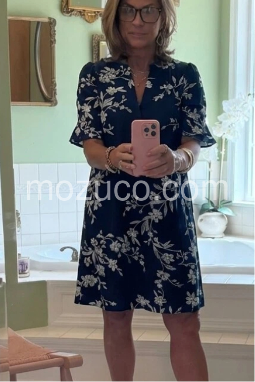 I absolutely love this dress! The fact that it has pockets is a huge win for me. The material is lightweight and perfect for my upcoming cruise. The navy blue and white floral pattern is so classic.