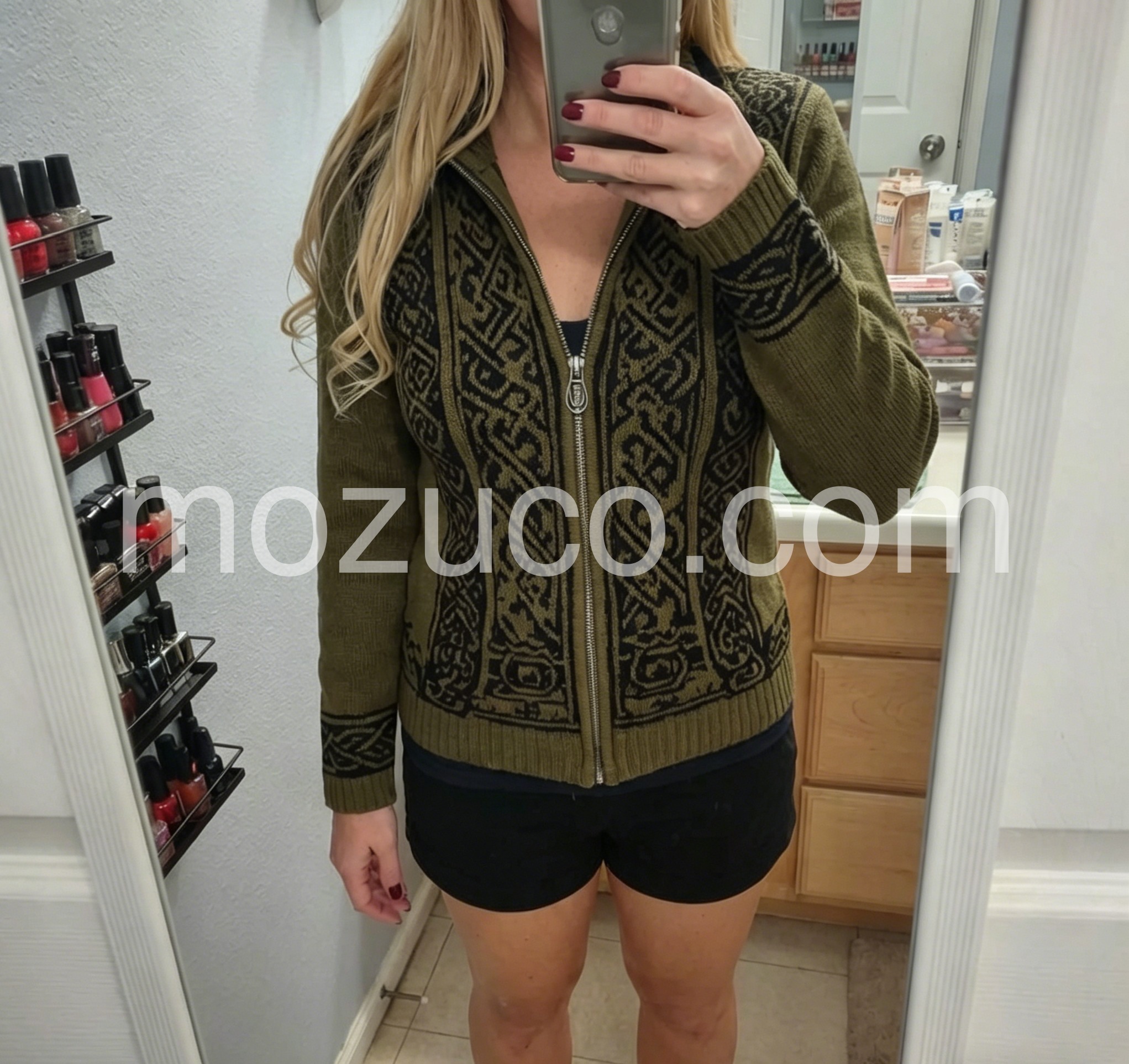 I’m obsessed with this vintage-style knit jacket! The earthy olive hue and ornate Nordic-inspired pattern feel so timeless and unique, way more interesting than basic sweaters. The wool-blend fabric is incredibly soft and insulating, perfect for layering over tees or turtlenecks. The fitted silhouette flatters my figure without being tight, and the silver zipper adds a sleek, polished touch. It’s become my go-to for weekend hikes, coffee runs, and even casual date nights—versatile, stylish, and so cozy!