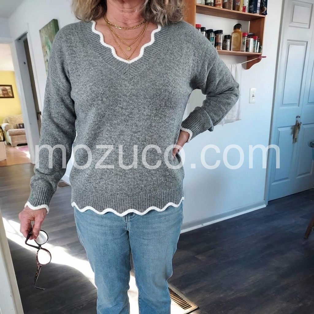 I absolutely love this sweater—it's so soft and comfortable, and the V-neck design looks flattering on everyone. The ribbed cuffs and hem with the little contrast trim add such a cute, polished touch. I’ve already worn it multiple times and it still looks great!