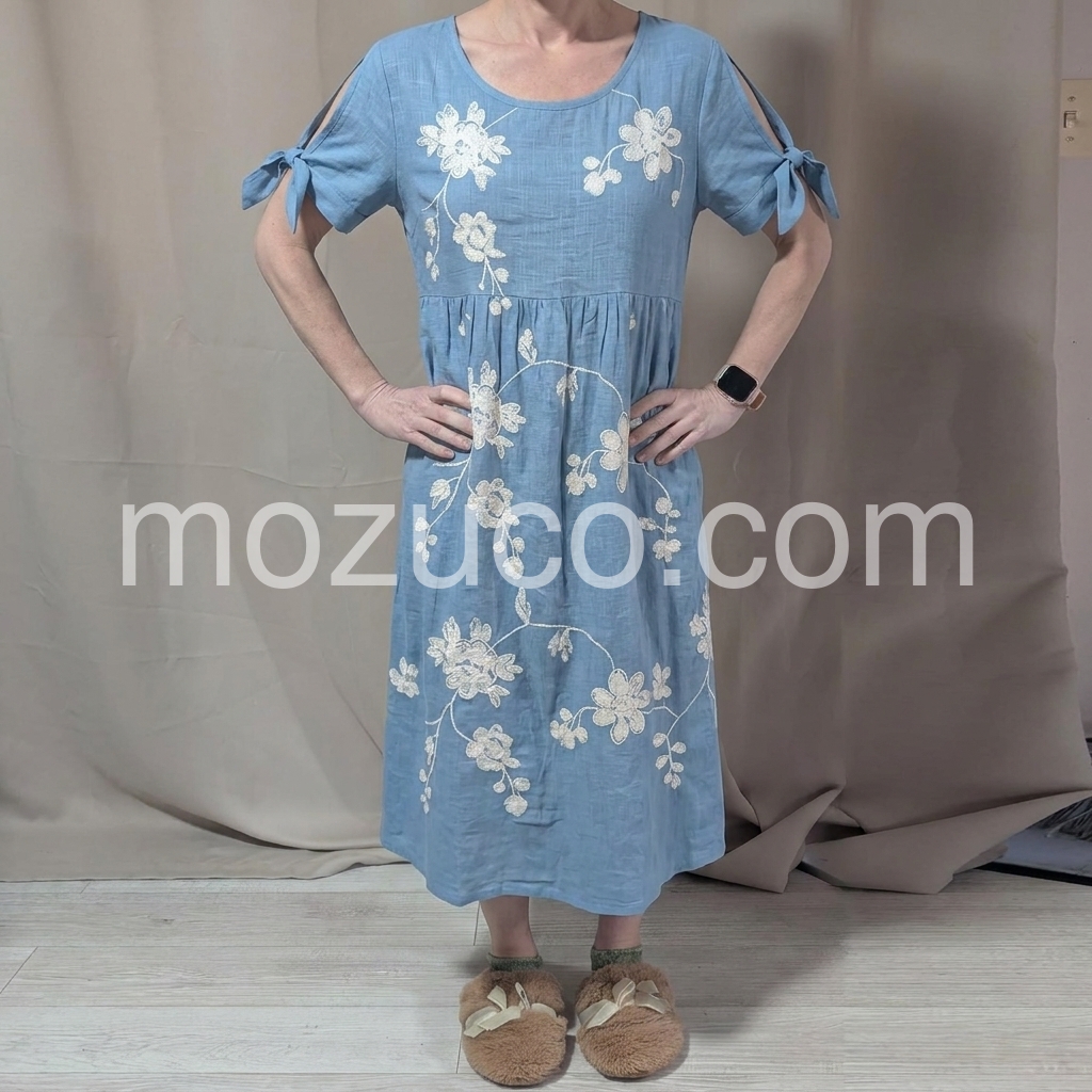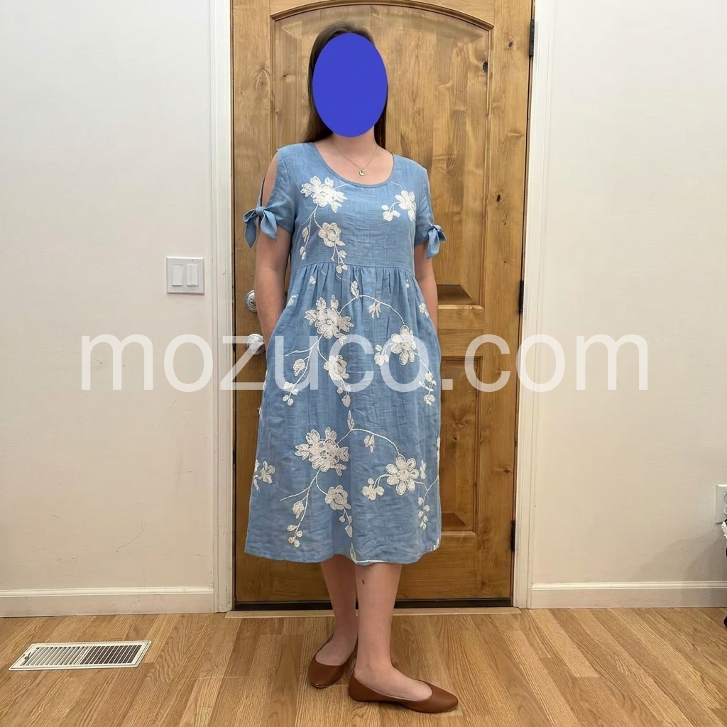 The sleeve ties are such a cute detail! This dress is so flowy and flattering. I carry a bit of extra weight in my midsection, and the loose fit just skims right over it. The fabric feels like a nice linen blend. Perfect for a summer day.