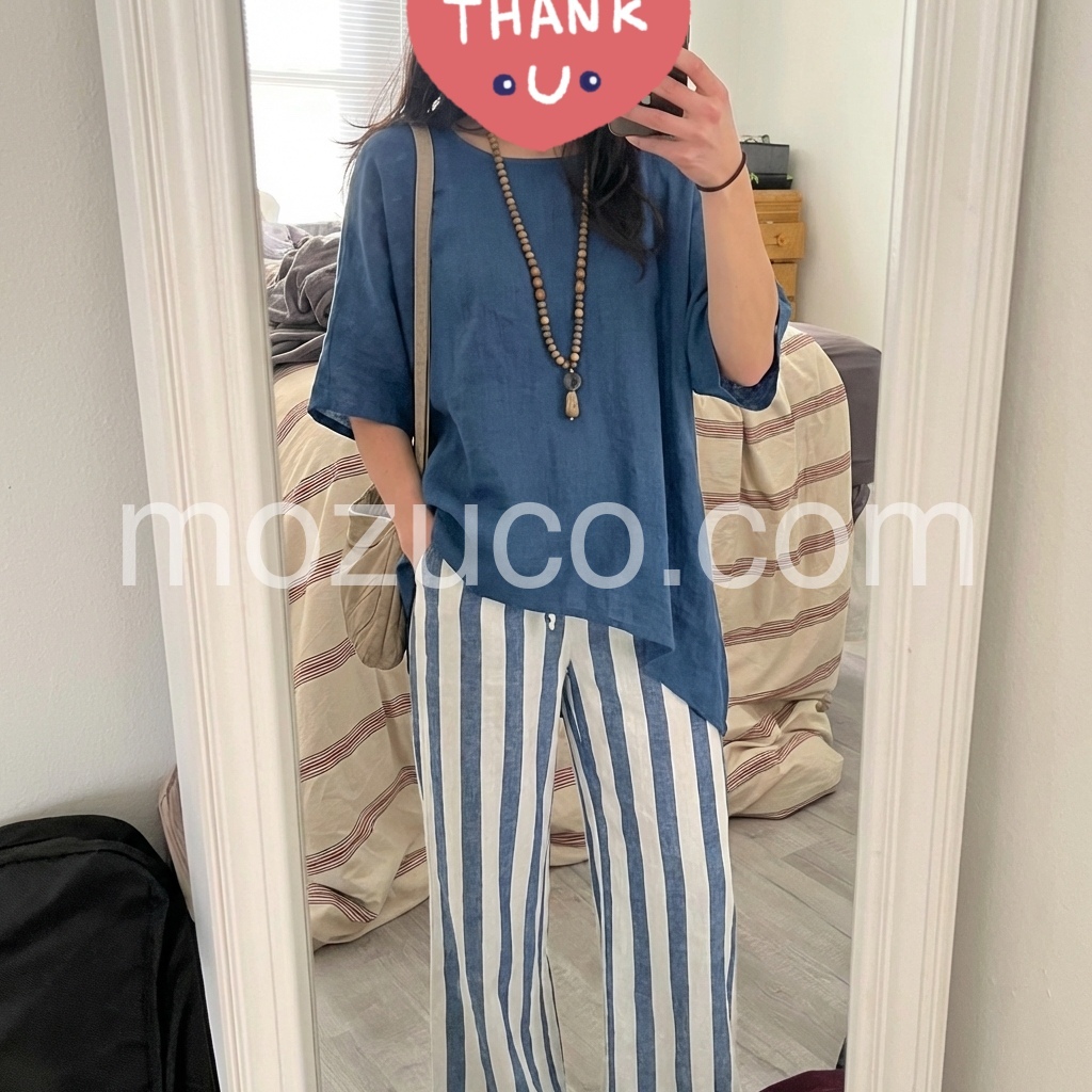 Love the casual elegance of this outfit. The navy blue top pairs so nicely with the blue and white striped bottoms. It is very versatile; I wear it as a lounge outfit at home and out for casual dinners.