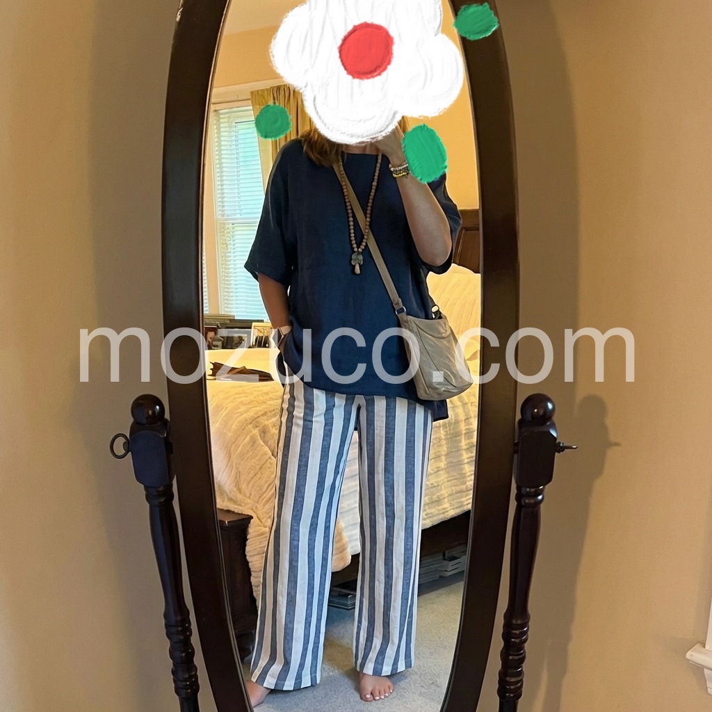 So comfy and chic. The dark blue tunic top drapes beautifully over the striped pants. It feels like wearing pajamas but looks put together enough for lunch with friends or running errands.