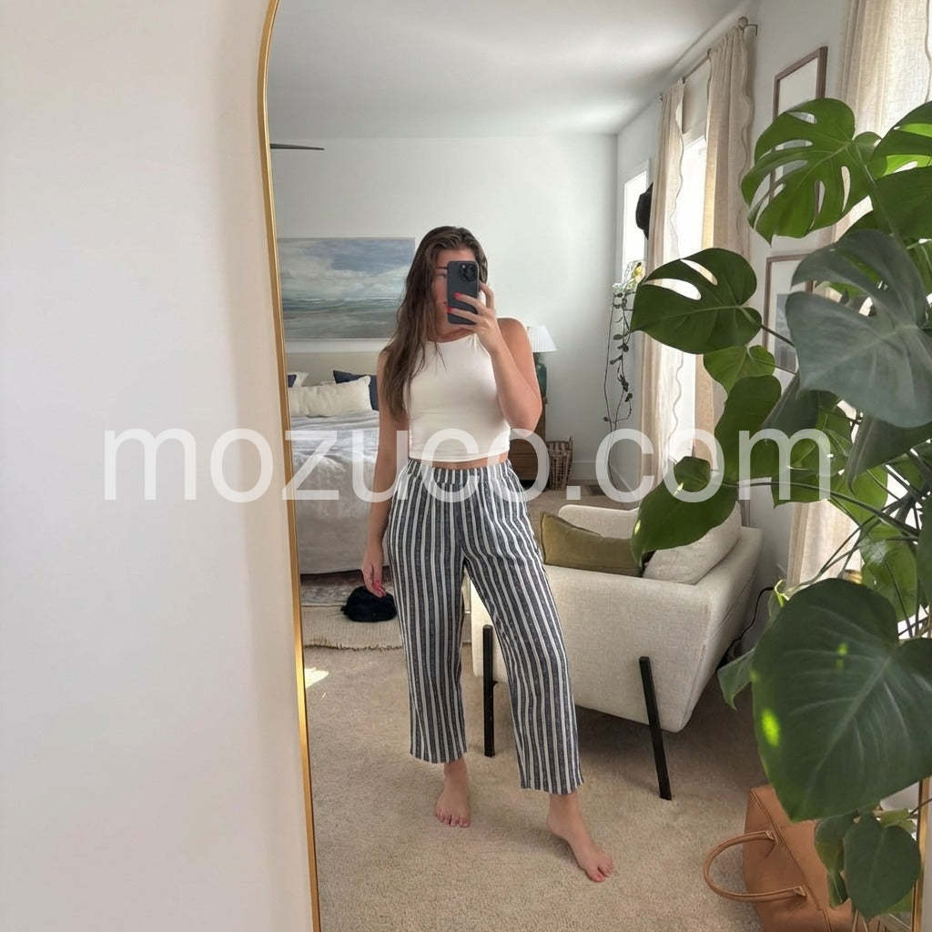 These pants are exactly what I was looking for! The fabric is so lightweight and breathable, perfect for summer. I love the striped pattern, it makes them look so chic even when paired with a simple tank top. Highly recommend!
