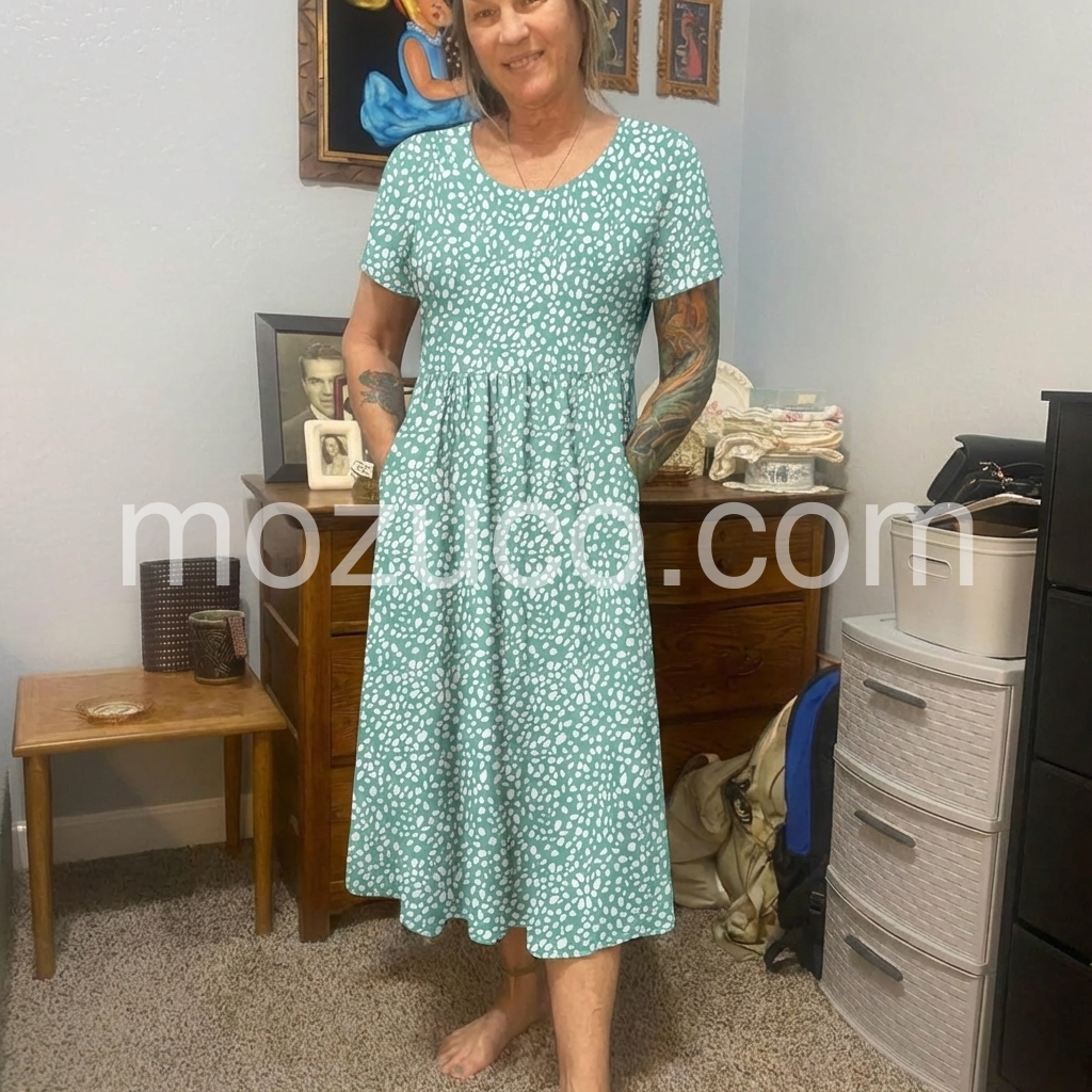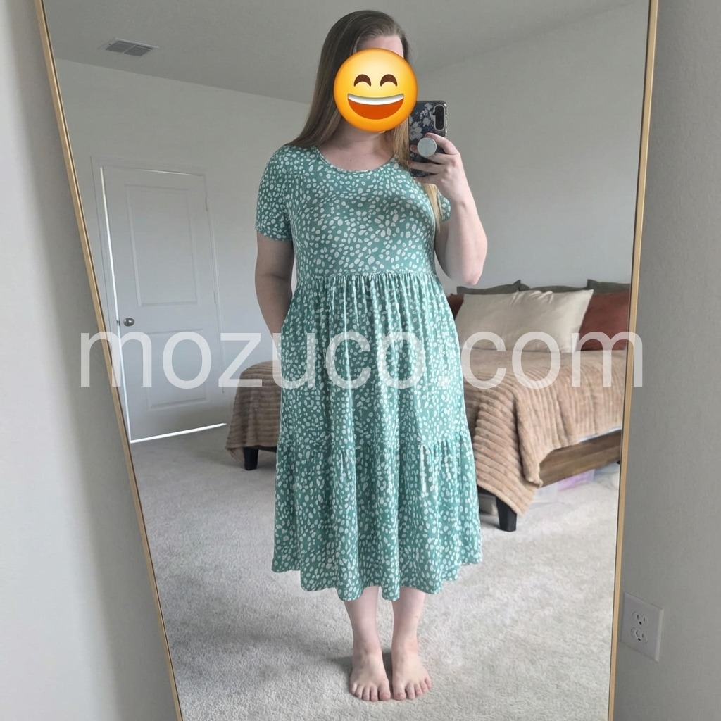 Such a great find! The midi length is perfect for me hitting right below the knee. The short sleeves provide just the right amount of coverage. The fabric is light and breathable, perfect for hot weather but not see-through at all.