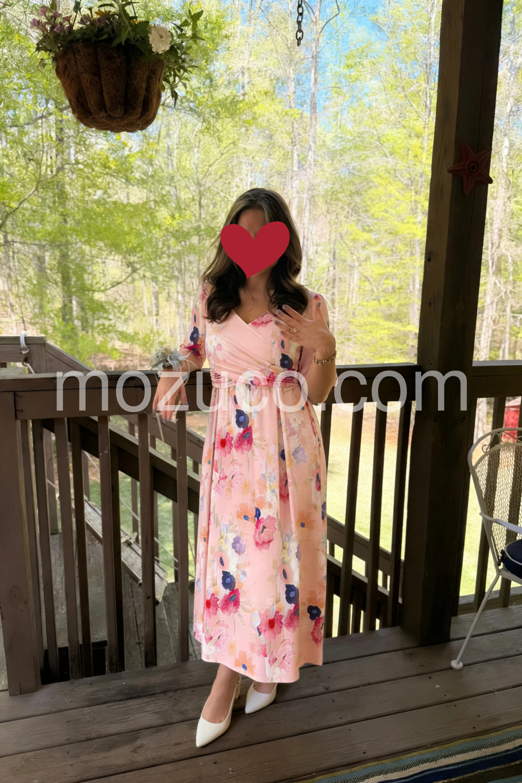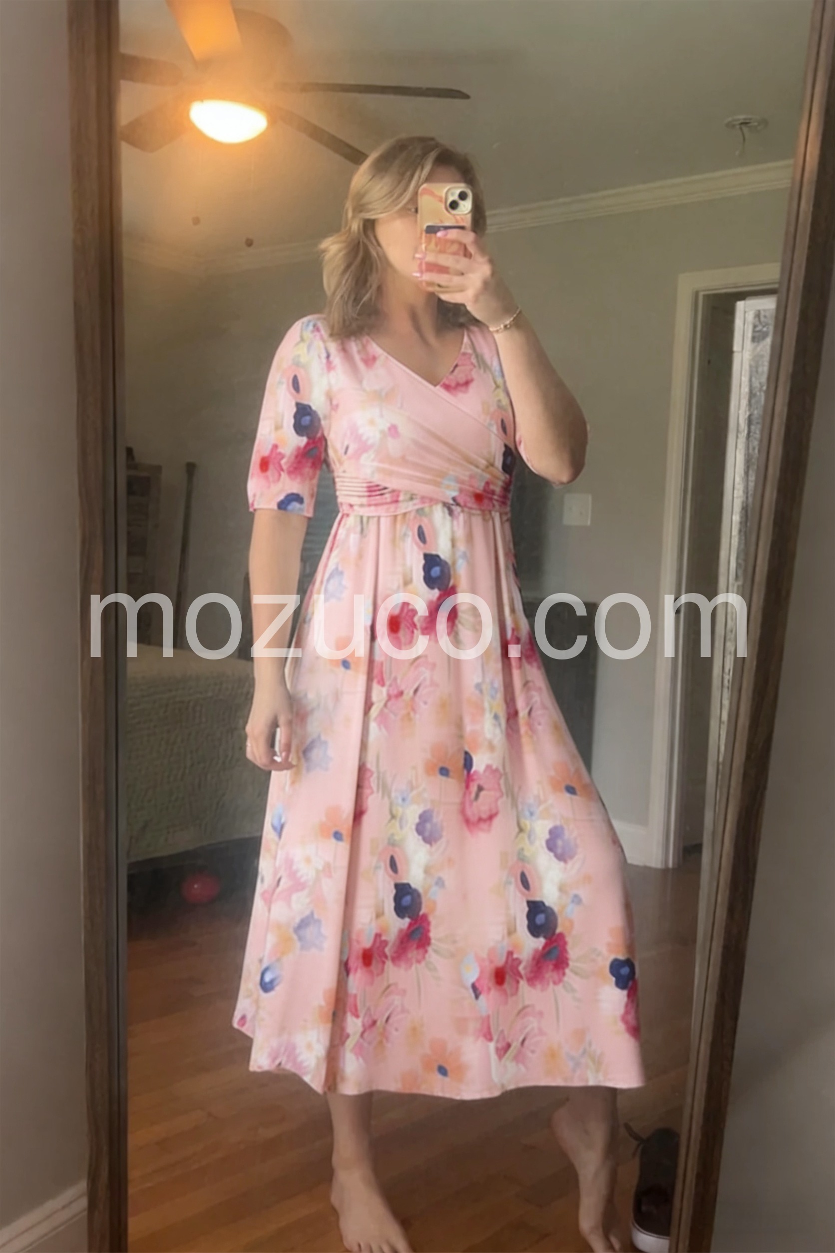 The crossover v-neck lays perfectly without exposing too much. It fits perfectly around my bust and waist. The light pink color with the bright flowers is so cheerful. I get compliments every time I wear it.
