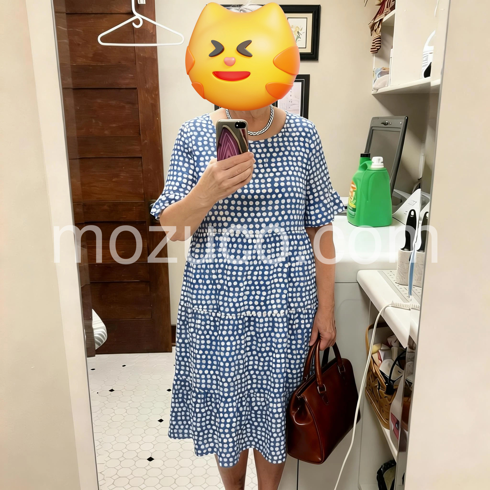 I love how effortless this dress looks while still feeling stylish. The fabric is light and breathable, and the relaxed cut is flattering in all the right ways—it skims my body instead of clinging. The blue-and-white dotted print is so classic. With a straw bag and simple sandals, it’s the perfect outfit for a getaway or a sunny day out.