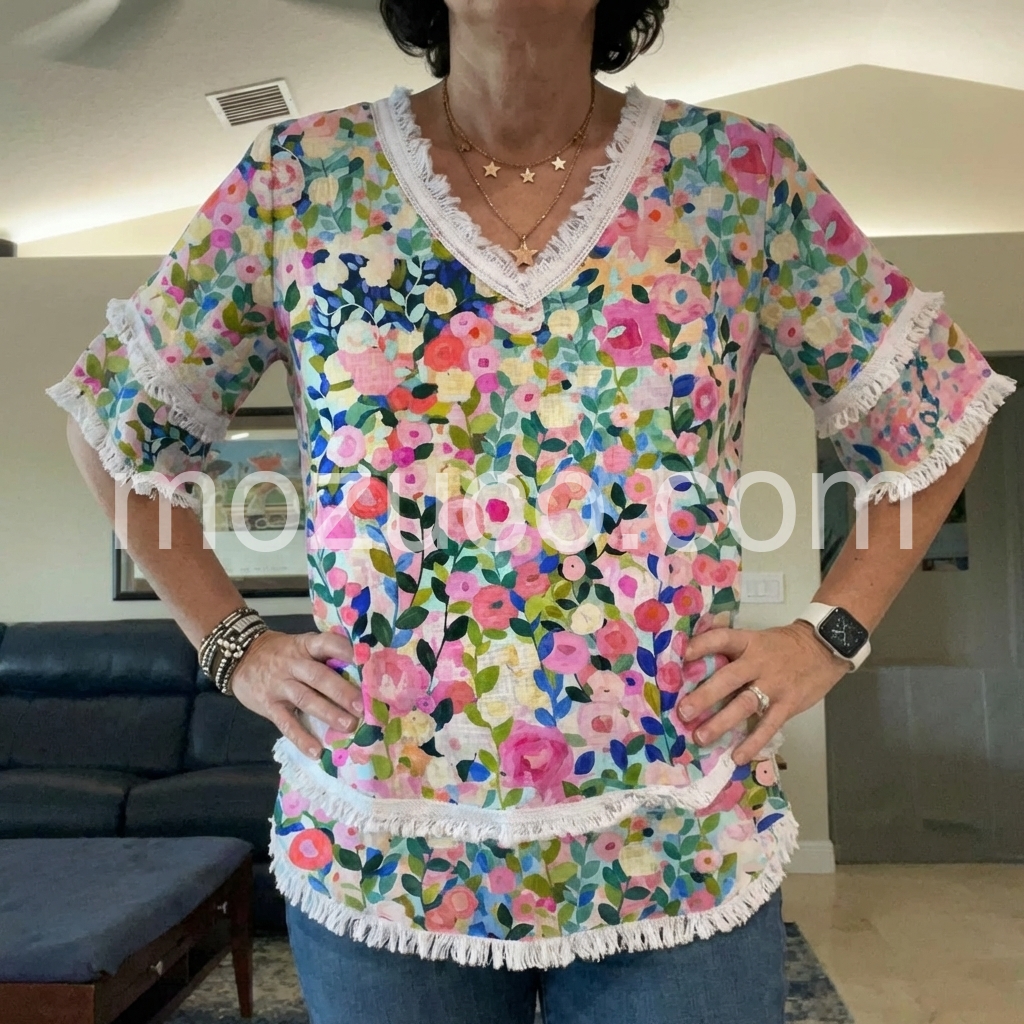 Five stars! This shirt exceeded my expectations. The fabric has a nice texture to it and the fringe trim is securely attached. It is so comfortable I want to wear it every day.