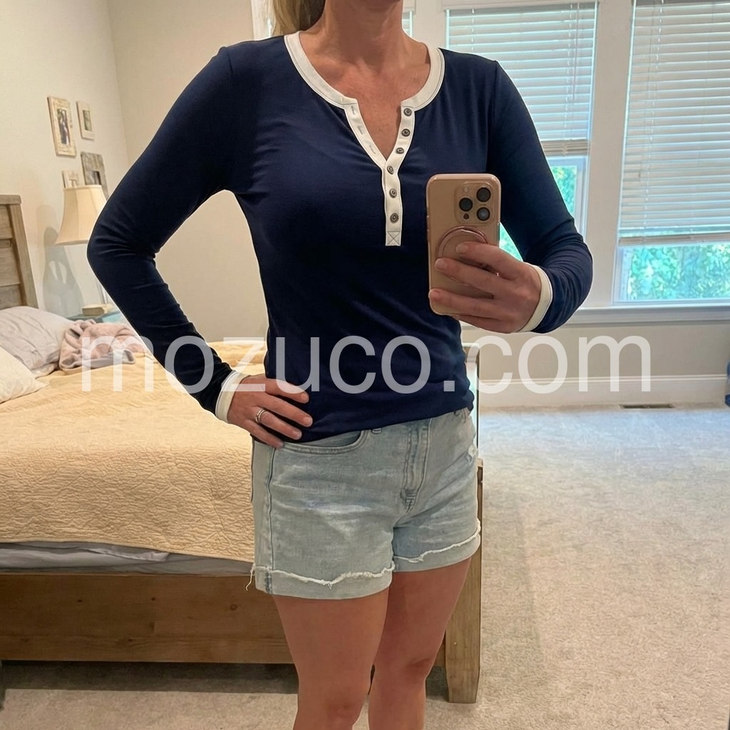I like this top. You can button all the way up or down depending on your comfort. Extra long sleeves and some good length so it is nice for layering. The material feels nice, it is very soft.