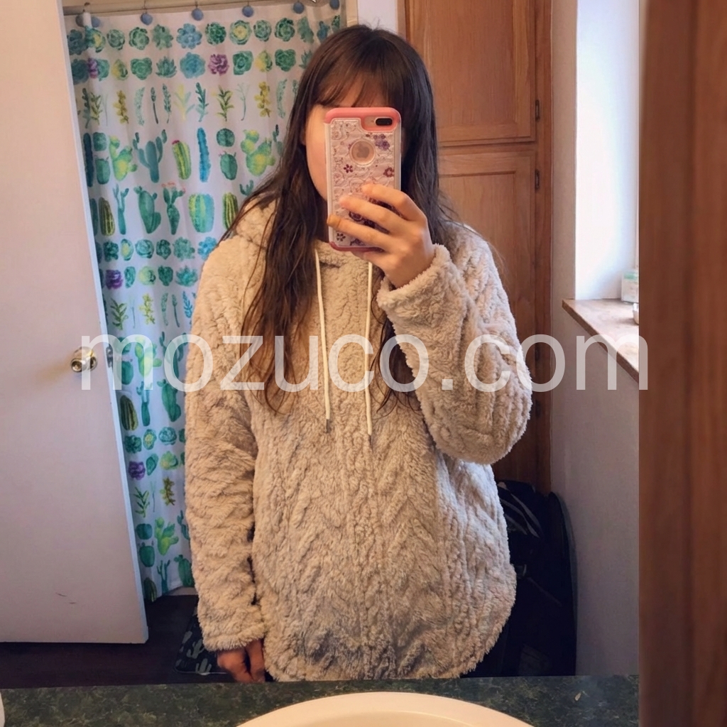 I’m obsessed with this cozy hoodie! The fuzzy material is so soft against my skin, and the thermal lining keeps me warm without being bulky. The relaxed fit is flattering and forgiving, great for lazy days or running errands. The hood with white drawstrings gives it a casual, cute look. It washes well too—no shedding or fading after a few cycles. My new go-to for chilly days!