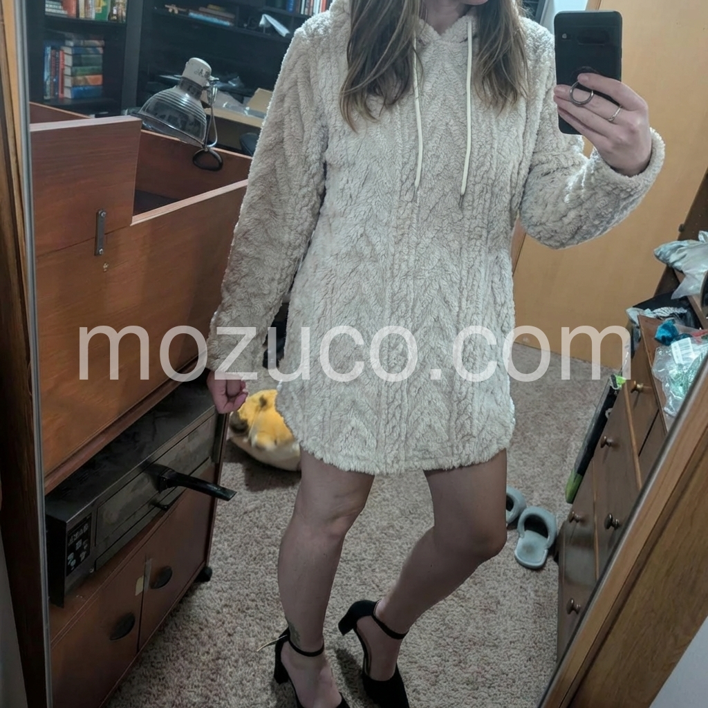 This fuzzy hooded tunic is a winter game-changer! The plush, thick fabric feels like wearing a cloud—so warm and cozy for cold mornings. The chevron pattern adds a cute texture, and the drawstring hood keeps the wind out. It’s long enough to cover my hips, pairing perfectly with leggings. The quality is amazing for the price!