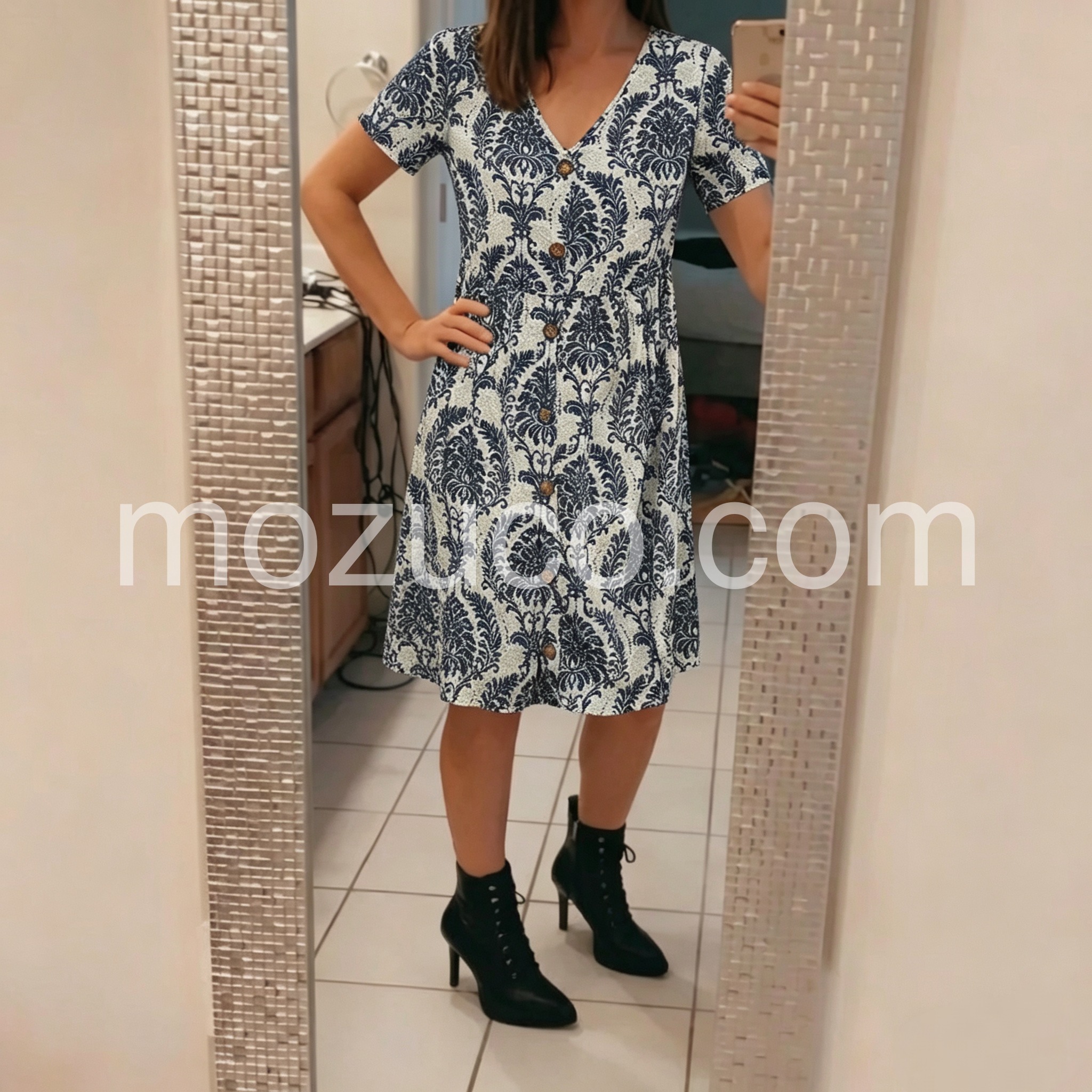 I was looking for something casual but put-together for weekend brunches, and this dress is exactly it. The length is great, hitting just above the knee for me (I am 5 foot 4). The navy damask print is very elegant. It washes well too, I just hang it to dry.