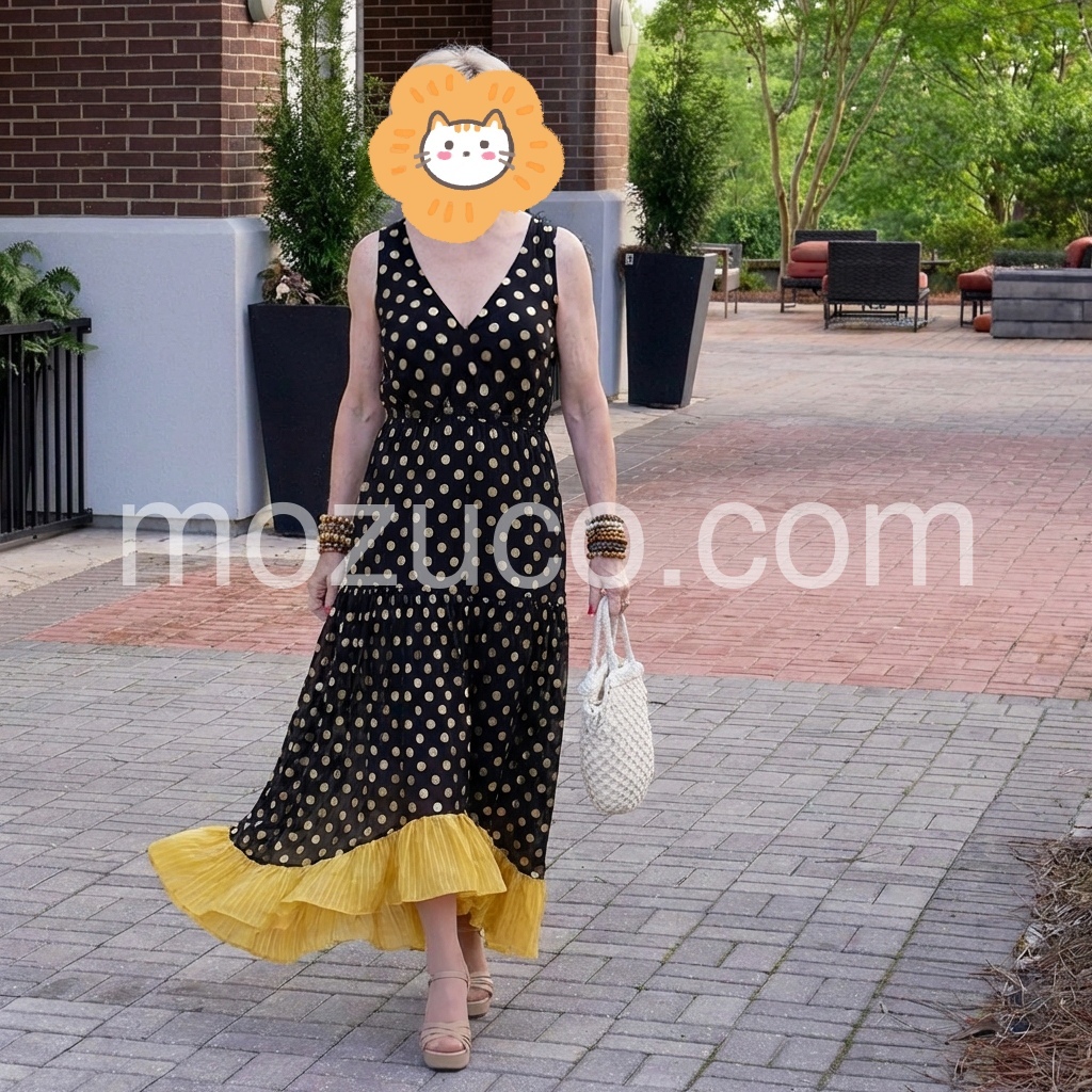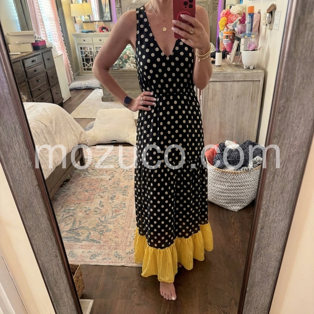 This is officially my new favorite summer dress. The fit is incredibly flattering and true to size. I love how it loosely drapes over my curves without looking bulky. The polka dot pattern is classic, but that pop of yellow at the hem gives it such a fun, boho twist. It is also surprisingly comfortable to wear all day long.